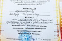 Мухамадиева Э. Р. приняла участие в Республиканских педагогических чтениях, посвященных выдающимся татарским просветителям, педагогам и общественным деятелям«Венец творения…».По итогам педагогических чтений педагог стала призёром в секции "Дошкольное образовательное учреждение и школа: преемственность и развитие".