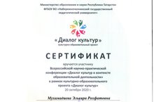 Мухамадиева Э.Р. приняла участие во Всероссийской научно-практической конференции "Диалог культур в контексте образовательной деятельности". Организатор конференции - ФГБОУ ВО "Набережночелнинский государственный педагогический университет".