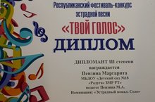 28 апреля 2018г. в МБУ ДО "Центр творчества ЗМР РТ" прошел Республиканский фестиваль-конкурс эстрадной песни "Твой голос". В конкурсе приняли участие более 150 детей и подростков Республики Татарстан. В состав жюри были приглашены заслуженные работники культуры и образования РТ. Детский сад "Радуга" представляла музыкальный руководитель Пензина М.А. В номинации "Эстрадный вокал.Соло" Маргарита Андреевна стала дипломантом III степени. Поздравляем!!! Желаем дальнейших побед!