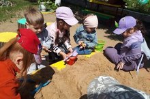 Весь год подготовишки опекали малышей: играли с ними, помогали одеваться на прогулку и раздеваться. Сегодня ребята из подготовительной группы учили маленьких делать куличики из песка.И в летнее время ещё ни раз придут с ними поиграть.