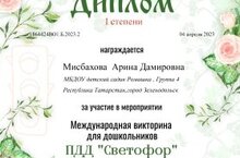 "Пчелки" әзерлек төркеме тәрбияләнүчеләре 1-5 апрельдә "Совушка" сайтында "ПДД Светофор" халыкара викторинасында катнаштылар һәм яхшы нәтиҗәләр күрсәттеләр. Безнең егетләр юл хәрәкәте кагыйдәләрен белә!