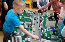 Занятие в кружке "ПасПешик". Тема "Работа на макете микрорайона". Дети, живущие поблизости от детского сада, нашли свой дом и показали безопасный путь от дома до детского сада. Все молодцы!