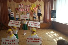 6 мая в нашем детском саду состоялся концерт, посвящённый 70-летию Великой Победы. Дети читали стихи, пели песни о войне, о солдатах, о Победе. Очень понравились зрителям танцы, которые исполнили дети, посещающие кружки ритмики и хореографии. И выступающие, и зрители прониклись атмосферой Великого праздника.