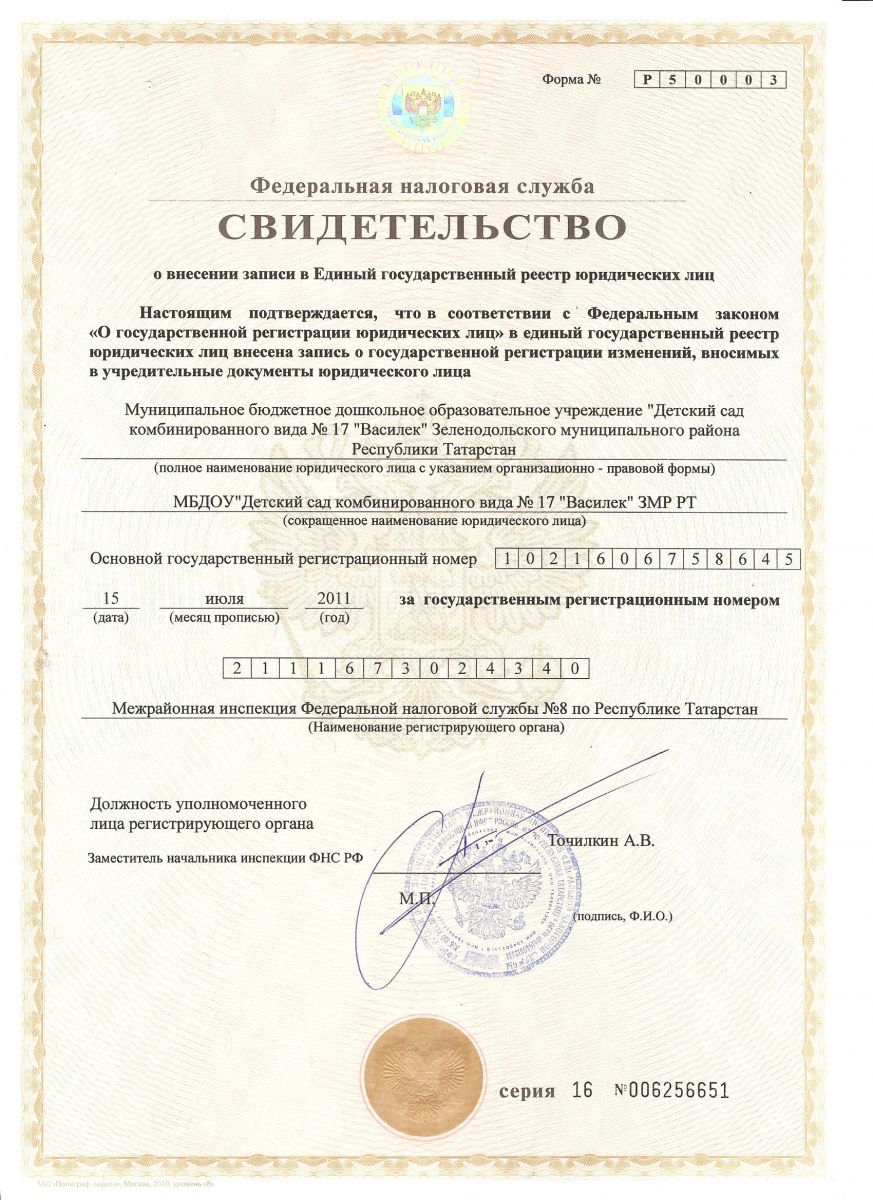 Свидетельство о внесении записи в единый государственный реестр юридических лиц