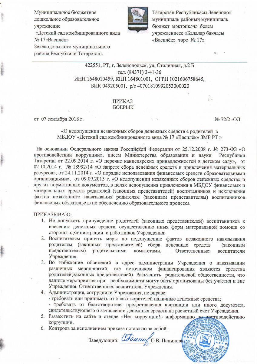 приказ о недопущении незаконных сборов денежных средств с родителей МБДОУ №17