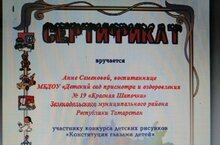 Поздравляем воспитанницу нашего детского сада Семенову Анну с сертификам по конкурсу "Конституция глазами детей"Безнең балалар бакчасында тәрбияләнүче Семенова Анна "Конституция балалар күзлегеннән"конкурсы буенча сертификатлар белән котлыйбыз