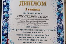 Наша воспитанница Сибгатуллина Самира приняла участие в 8 Республиканских чтениях "Человек и космос"и стала Победителем.Поздравляем!!! -