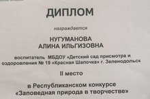 14 июньдә Татарстан Республикасы Министрлар Кабинетының "13 нче номерлы комбинацияле балалар бакчасы "МДОУ базасында Мәктәпкәчә белем бирү оешмалары педагоглары арасында"юлда куркынычсыз тәртип формалаштыруда цифрлы белем бирү практикасы "муниципаль конкурсында катнашучыларны бүләкләү булды . Нугуманова Алина Илгиз кызы "Power Point2"сервисында булдырылган электрон белем бирү ресурслары" номинациясендә 3 урынны алды. Котлыйбыз!!!