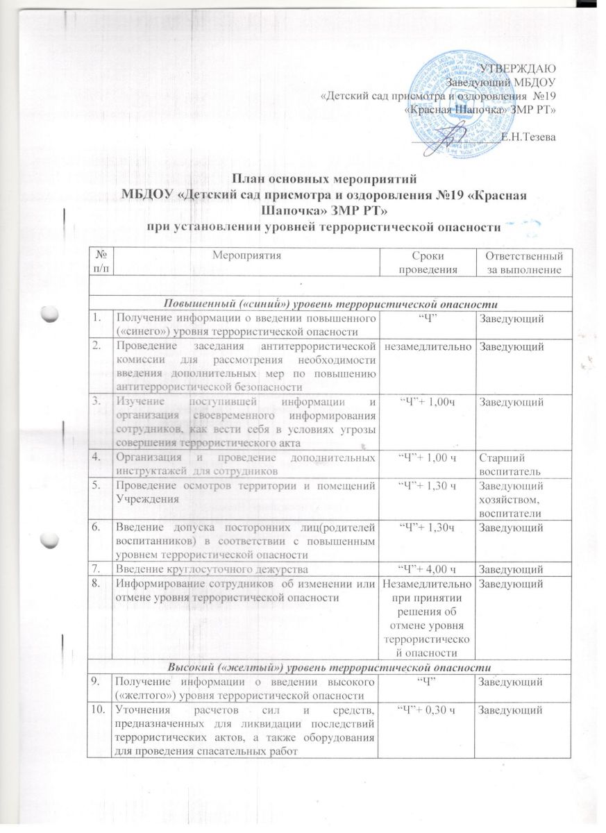 План мероприятий при установлении уровней террористической опасности в учреждении
