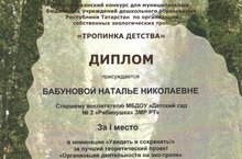 Педагоги нашего детского сада участвовали в Республиканском конкурсе для муниципальных бюджетных учреждений дошкольного образования Республики Татарстан по организации собственных экологических троп "Тропинка Детства". Бабунова Н.Н. заняла 1,2 и 3 призовые места в номинациях "Увидеть и сохранить" , "Приглашаю на тропу!" и "В гармонии с природой" . Павишина Е.А и Чекмарева С.О. - вторые места в номинации методических разработок "Приглашаю на тропу!" Поздравляем !!! / Безнең балалар бакчасы педагоглары Татарстан Республикасының мәктәпкәчә белем бирү муниципаль бюджет учреждениеләре өчен "Балачак сукмагы"дигән үз экологик сукмакларын оештыру буенча республика конкурсында катнаштылар. Бабунова н. Н. "күрергә һәм сакларга" , "сукмакка чакырам!"һәм "табигать белән гармониядә". Павишина Е. А. һәм Чекмарева С. О. - методик эшләнмәләр номинациясендә "тропикка чакырам!"Котлыйбыз !!!
