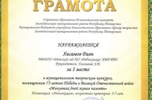 Поздравляем с призовым 1 местом воспитанника группы №4 Хисамова Раяна в муниципальном творческом конкурсе, посвященном 75-летию Победы в Великой Отечественной войне "Минувших дней живая память". Номинация "Аппликация" / 4 нче төркем тәрбиячесе Хисамова Раянны Бөек Ватан сугышында җиңүнең 75 еллыгына багышланган "үткән көн Тере хәтер"дип исемләнгән муниципаль иҗади конкурста призлы 1 урын белән котлыйбыз. Аппликация " Номинациясе"