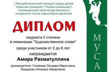 Поздравляем Амиру Рахматуллину, воспитанницу 7 группы, с победой в I Республиканском конкурсе среди детей "Красная ромашка" ("Кызыл ромашка"), посвященном творчеству великого татарского поэта-героя Мусы Джалиля.