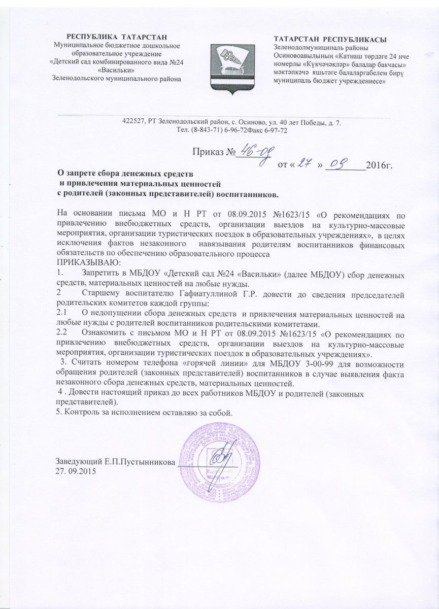 Приказ по МБДОУ о запрете сбора денежных средств