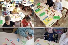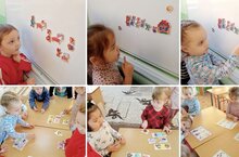 Наши самые младшие воспитанники развивают мелкую моторику рук на занятиях по лепке, старательно прикрепляя шарики из пластилина к крылышкам божьей коровки.