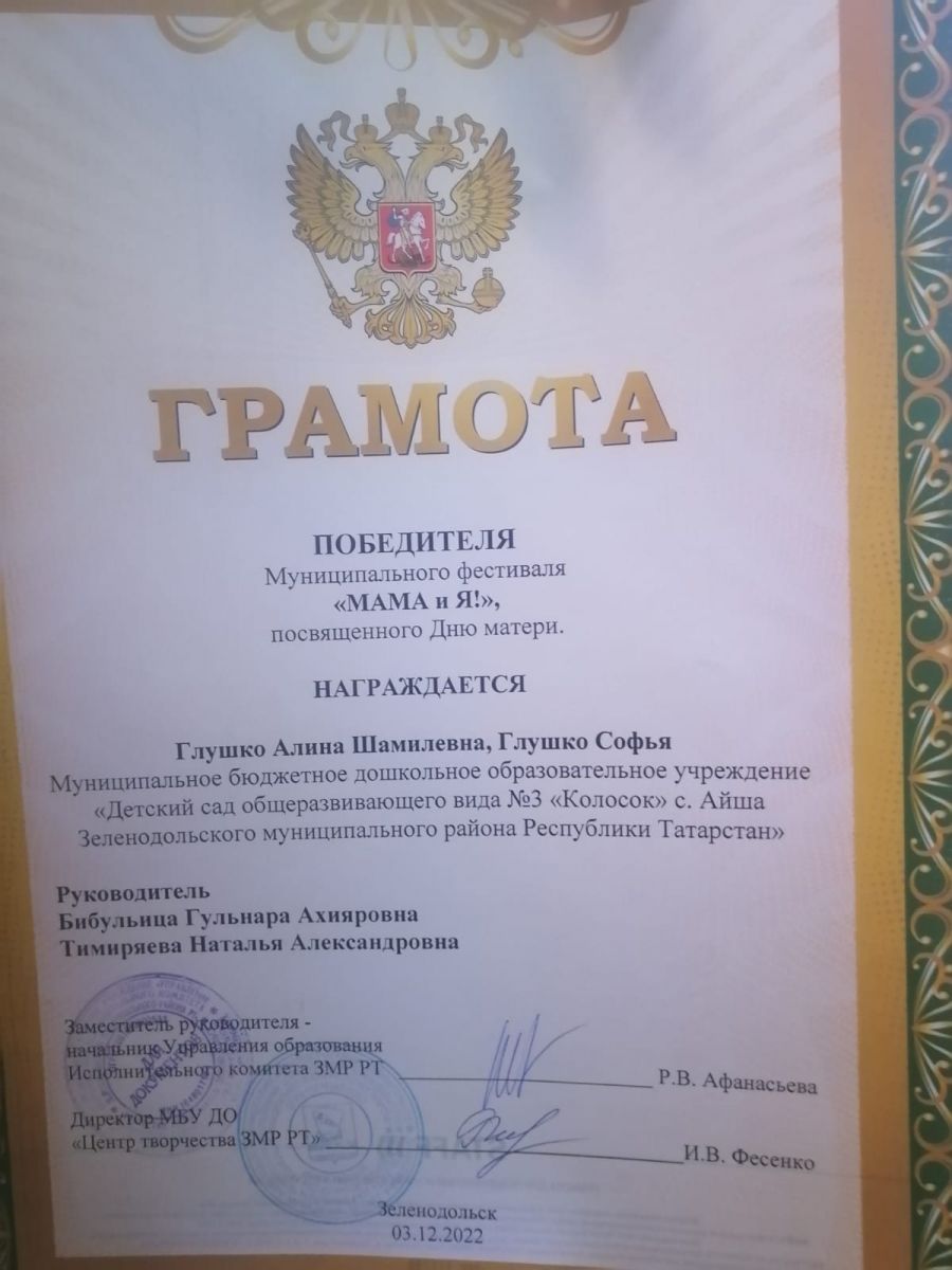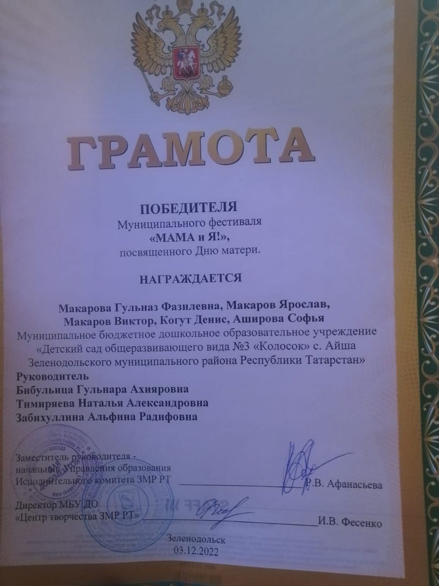 Поздравляем победителей в Муниципальном Фестивале "Мама и я" Глушко Алину Шамилевну, Глушко Софью, Когут Гульназ Фазилевну, Макарова Ярослава, Макарова Виктора, Аширову Софью, Аширову Юлию Юрьевну, Когут Дениса, Бибульица Гульнару Ахияровну, Тимиряеву Наталью Александровну, Забихуллину Альфину Радифовну.