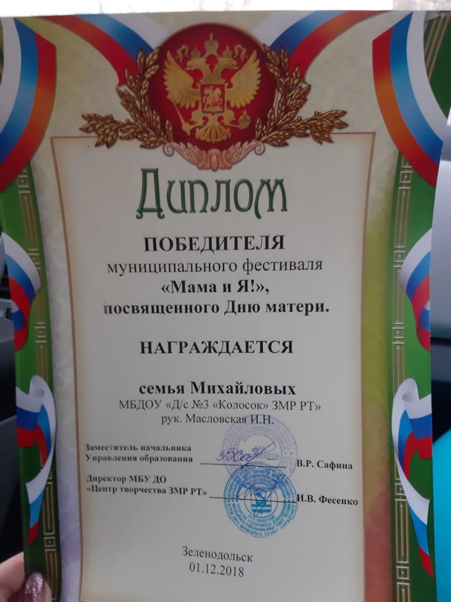 Диплом Победителя Муниципального фестиваля "Мама и Я" посвященного Дню матери Награждается семья Михайловый.