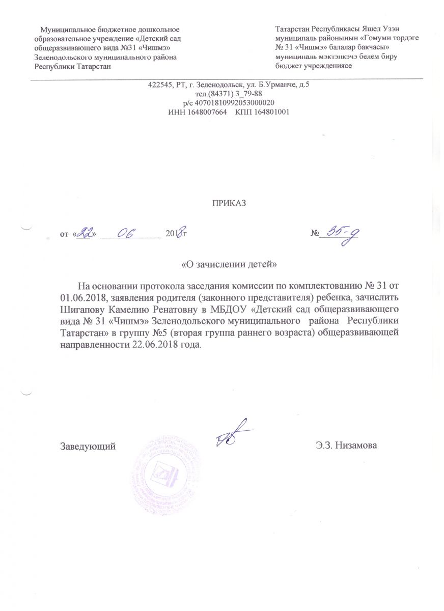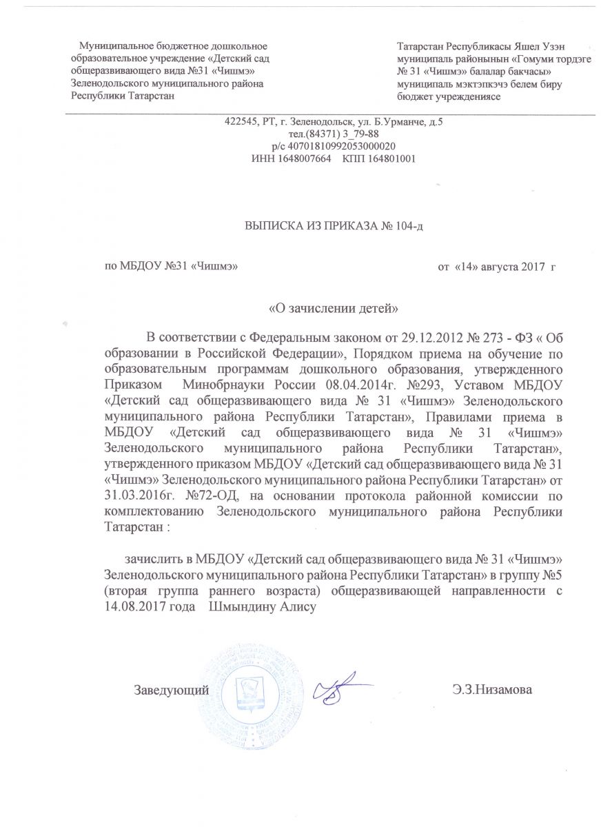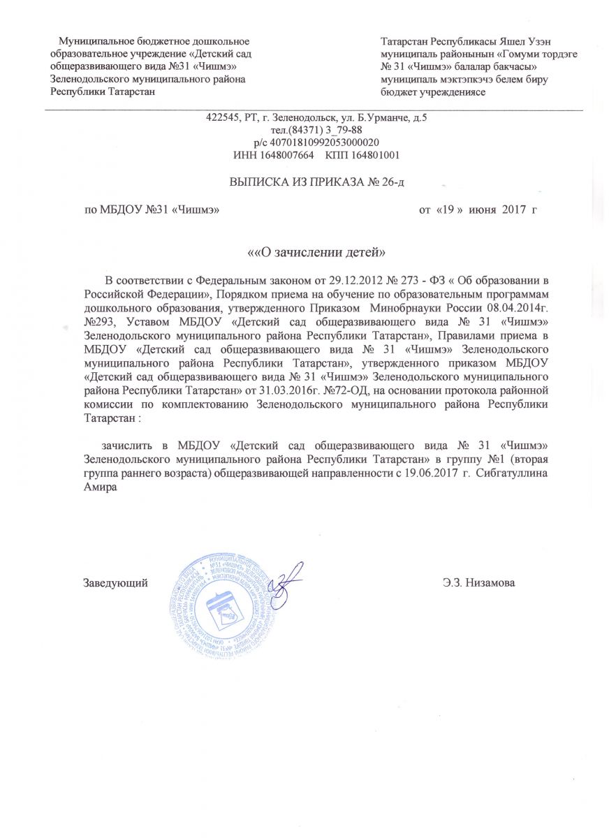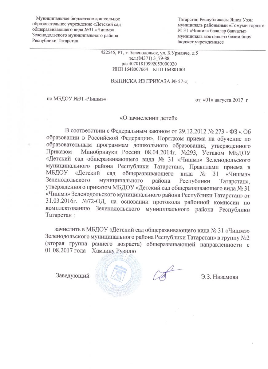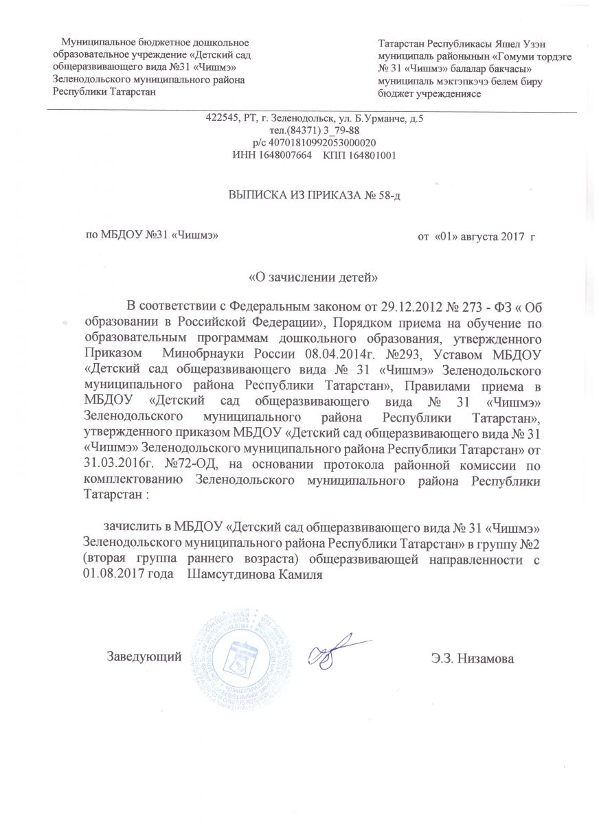 Выписка из приказа о зачислении Шамсутдиновой Камили
