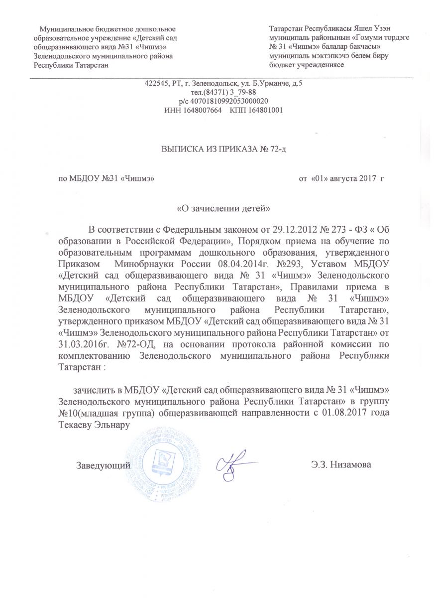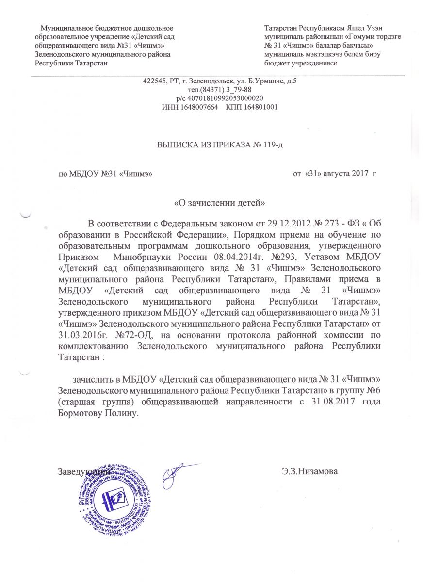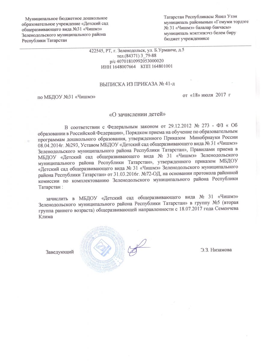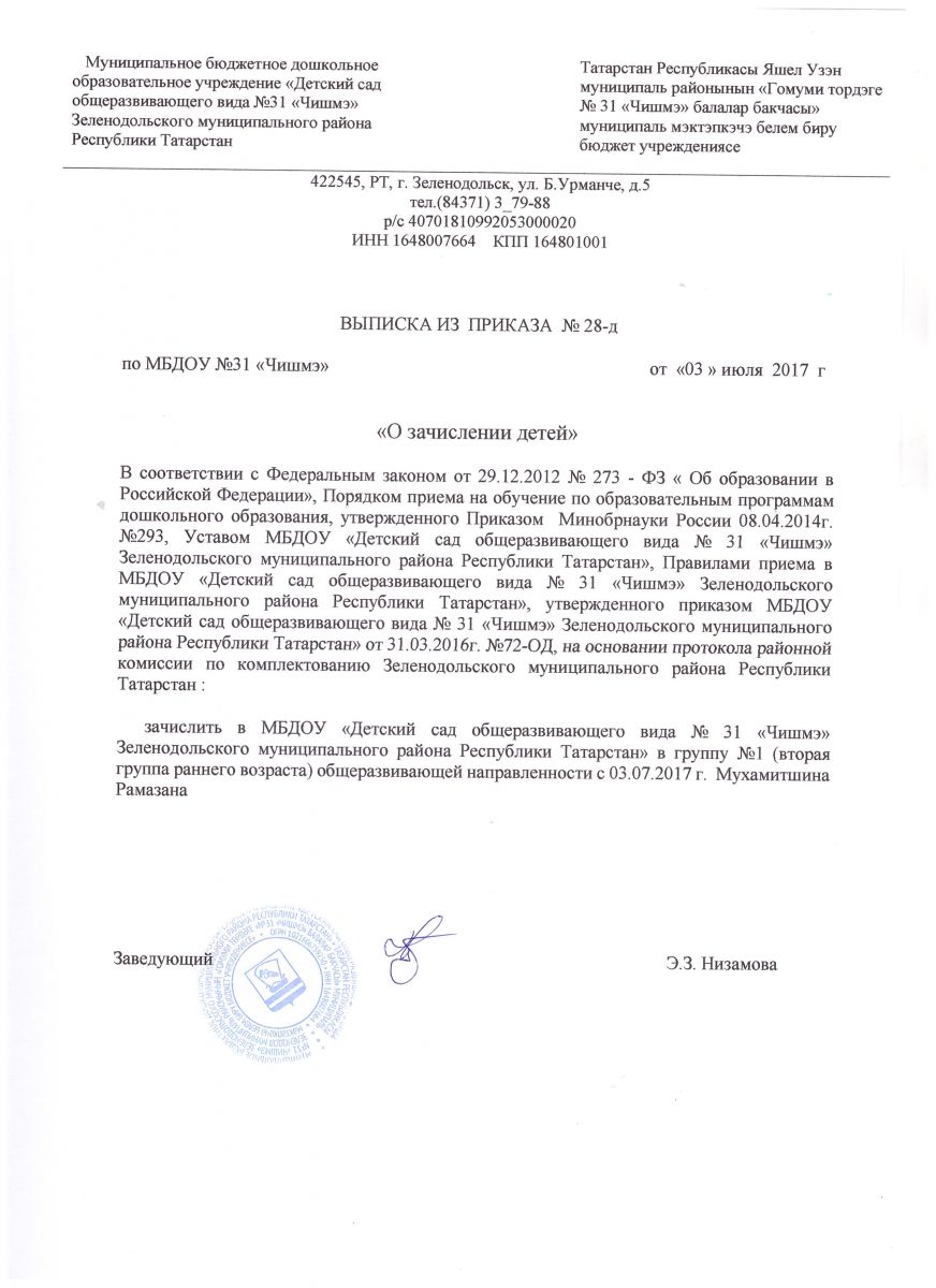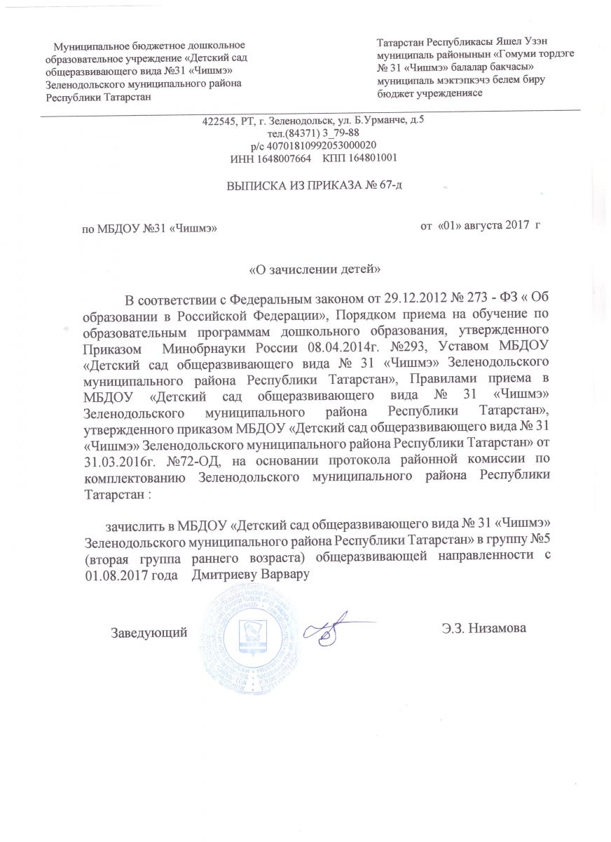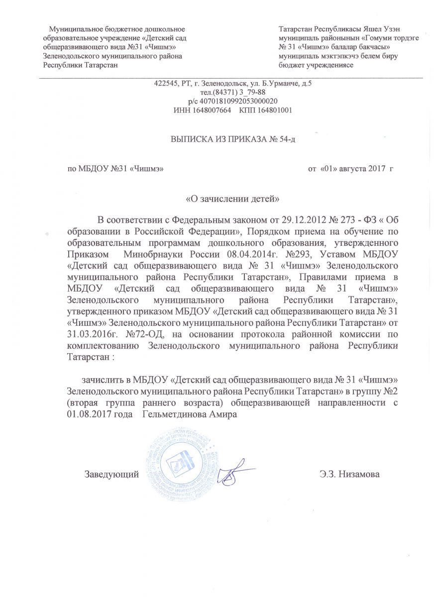 Выписка из приказа о зачислении Шамсутдиновой Камили