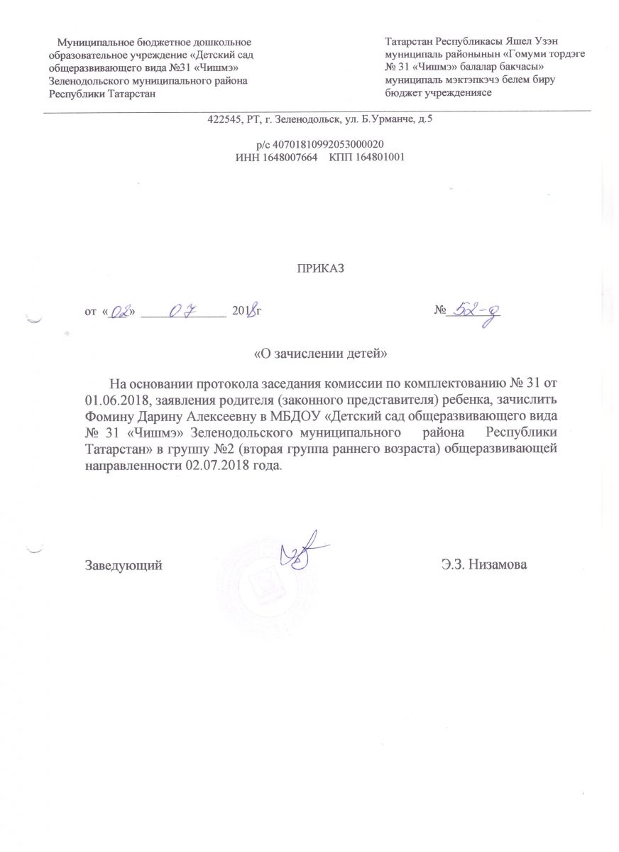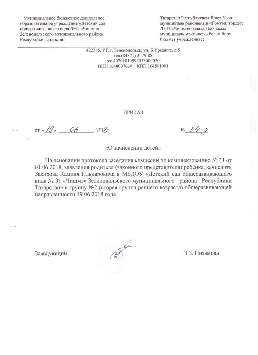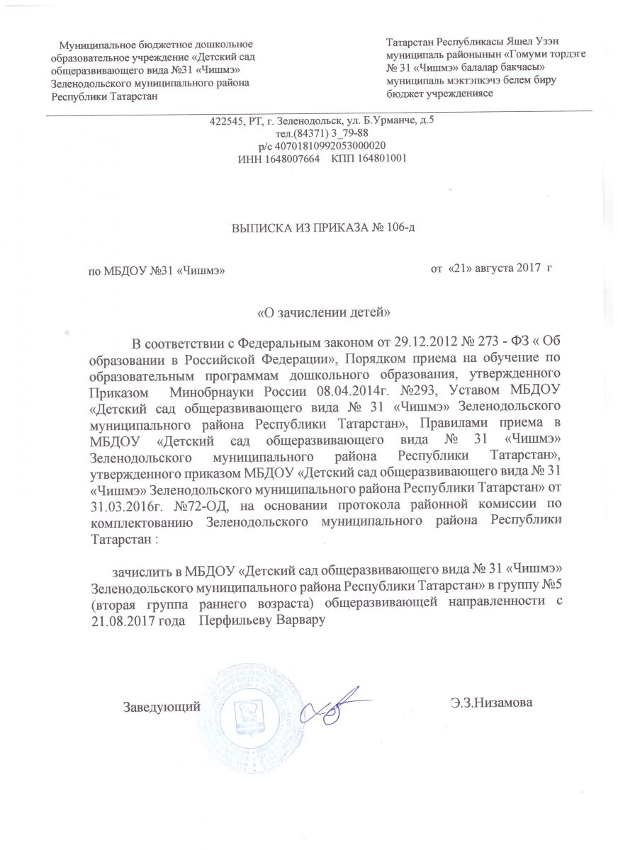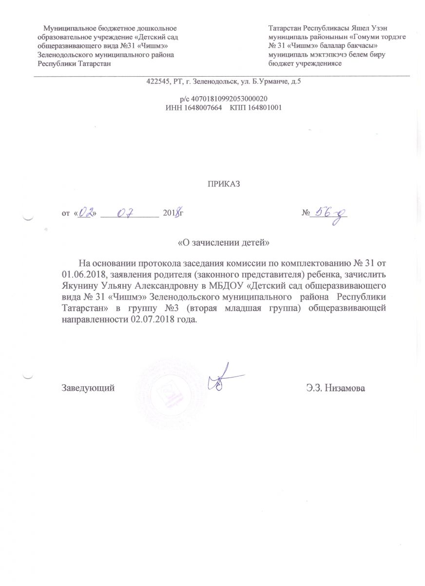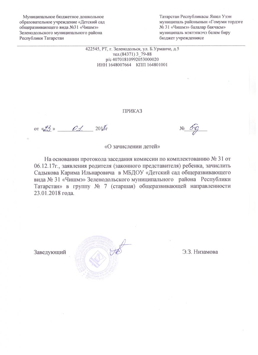 Выписка из приказа о зачислении Шамсутдиновой Камили