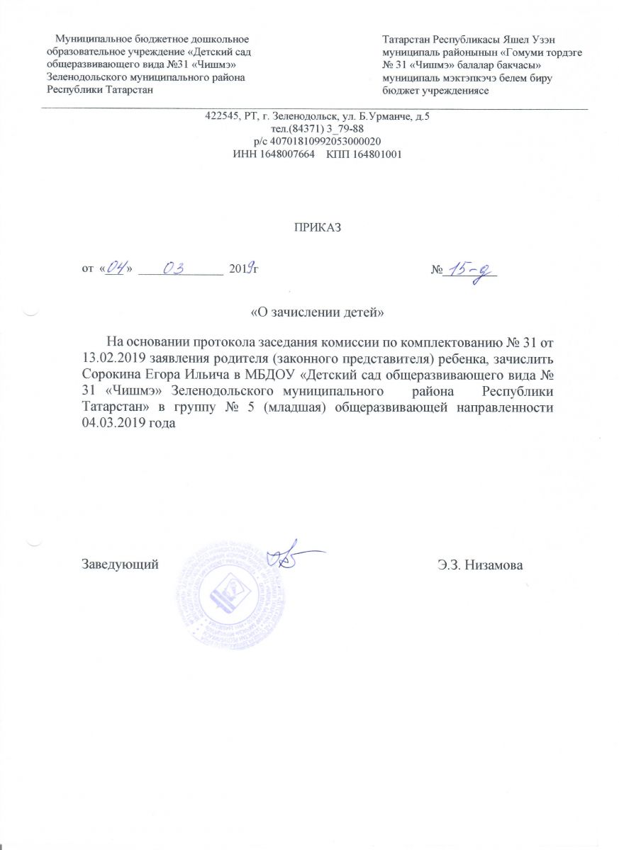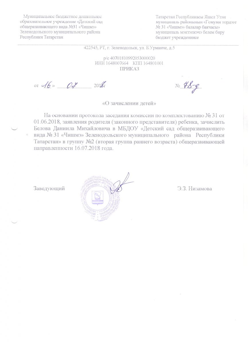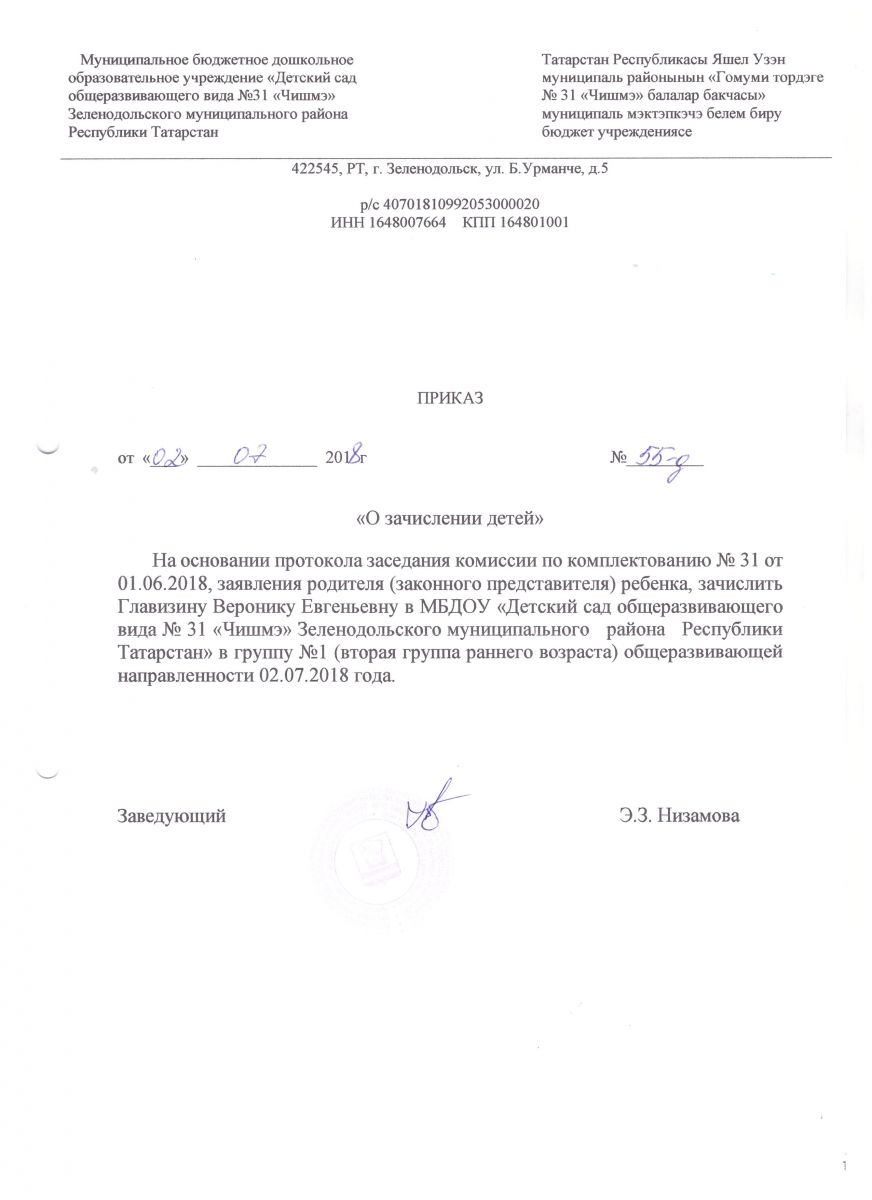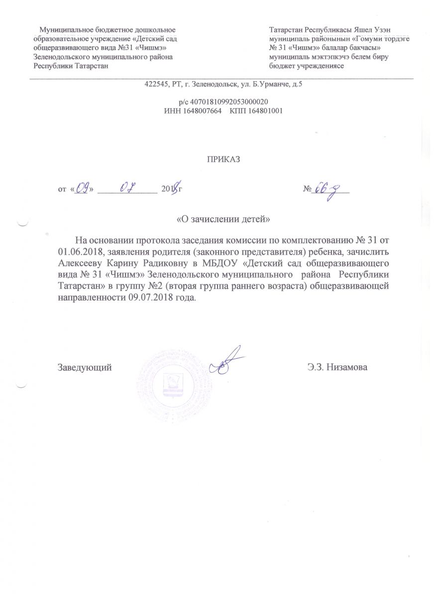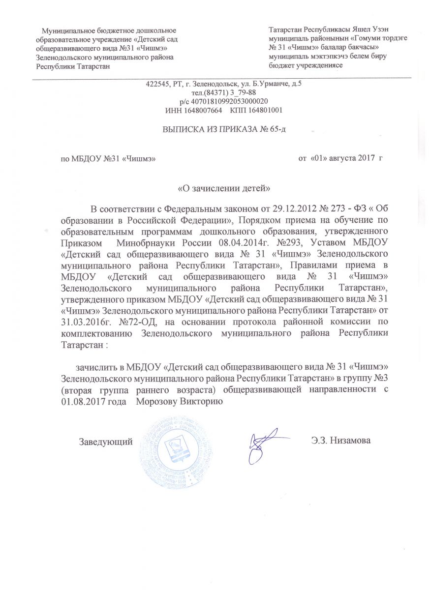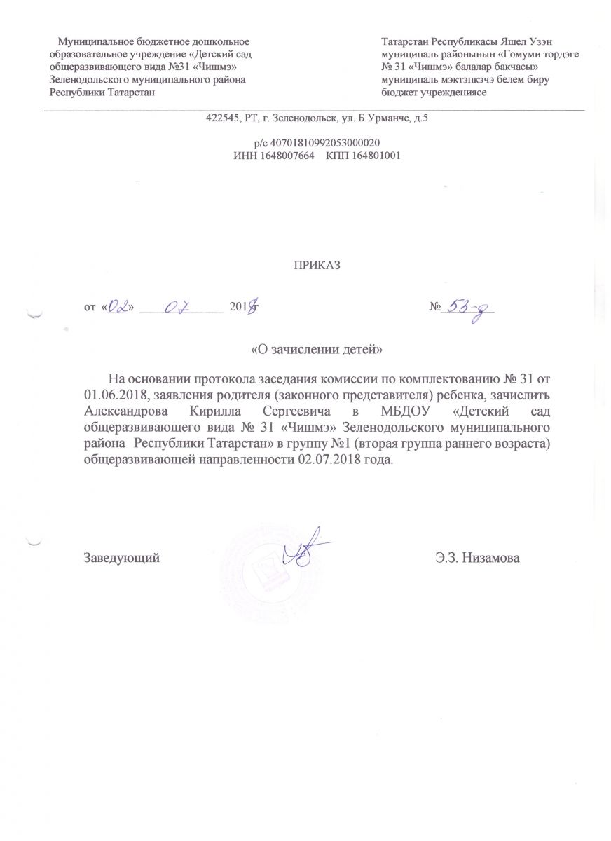 Выписка из приказа о зачислении Шамсутдиновой Камили
