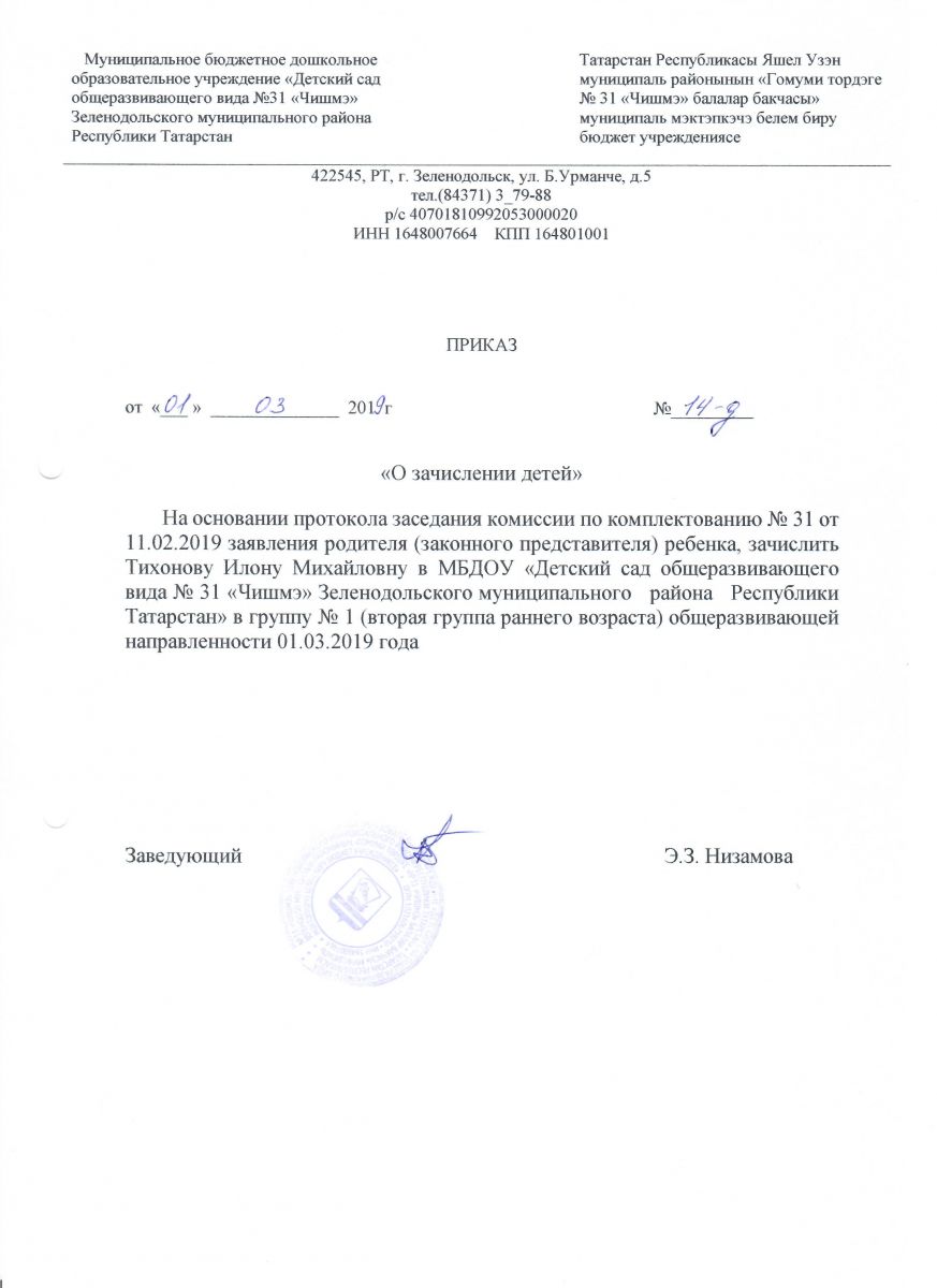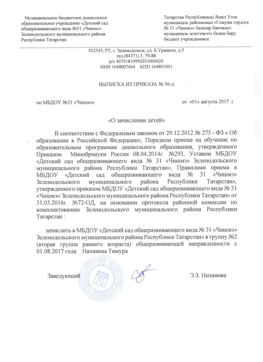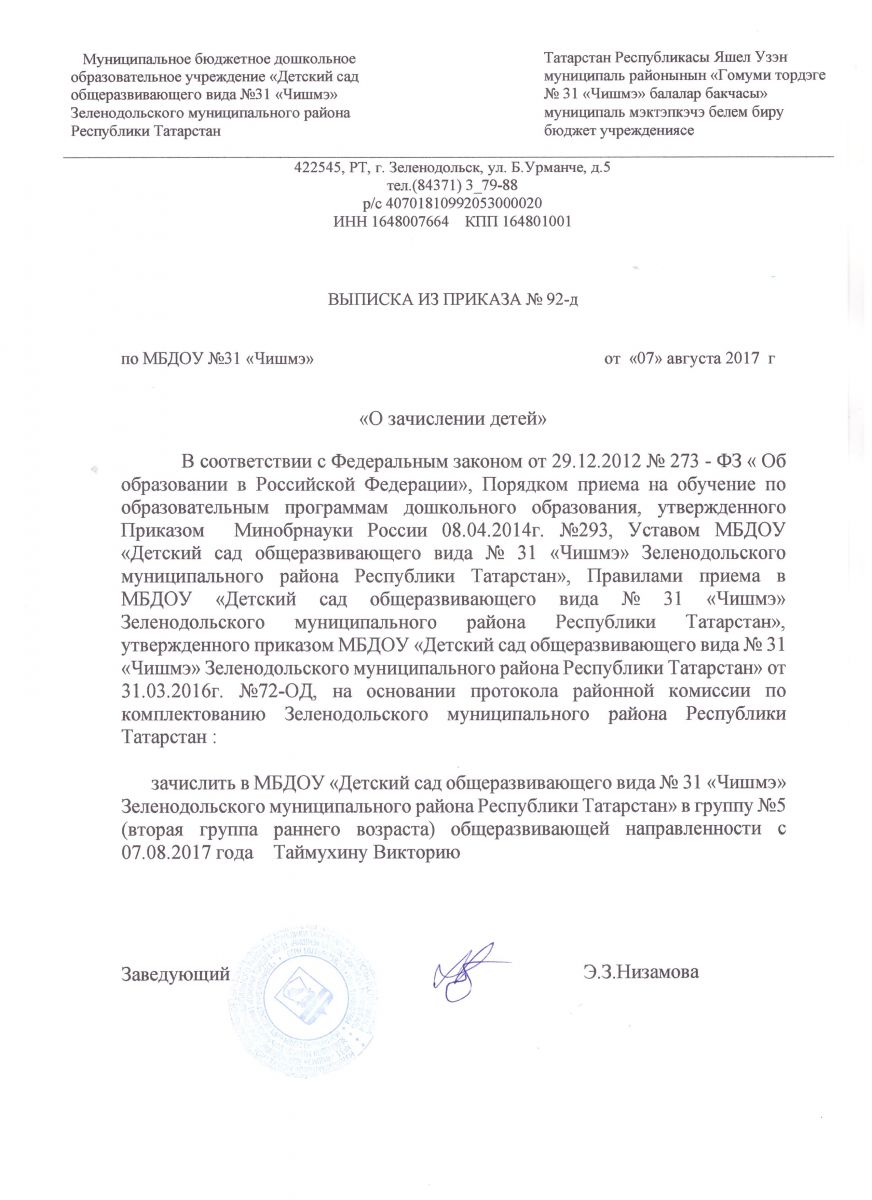 Выписка из приказа о зачислении Тимуршиной Азалии