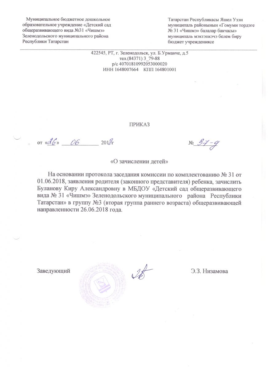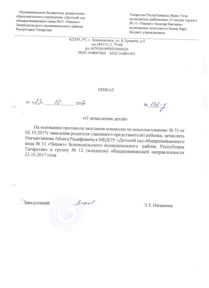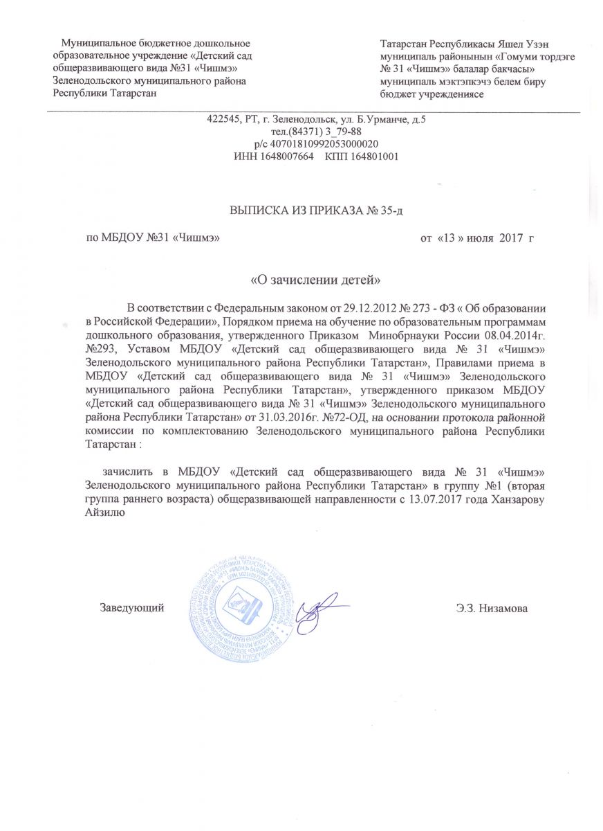 Выписка из приказа о зачислении Ханзарову Айзилю