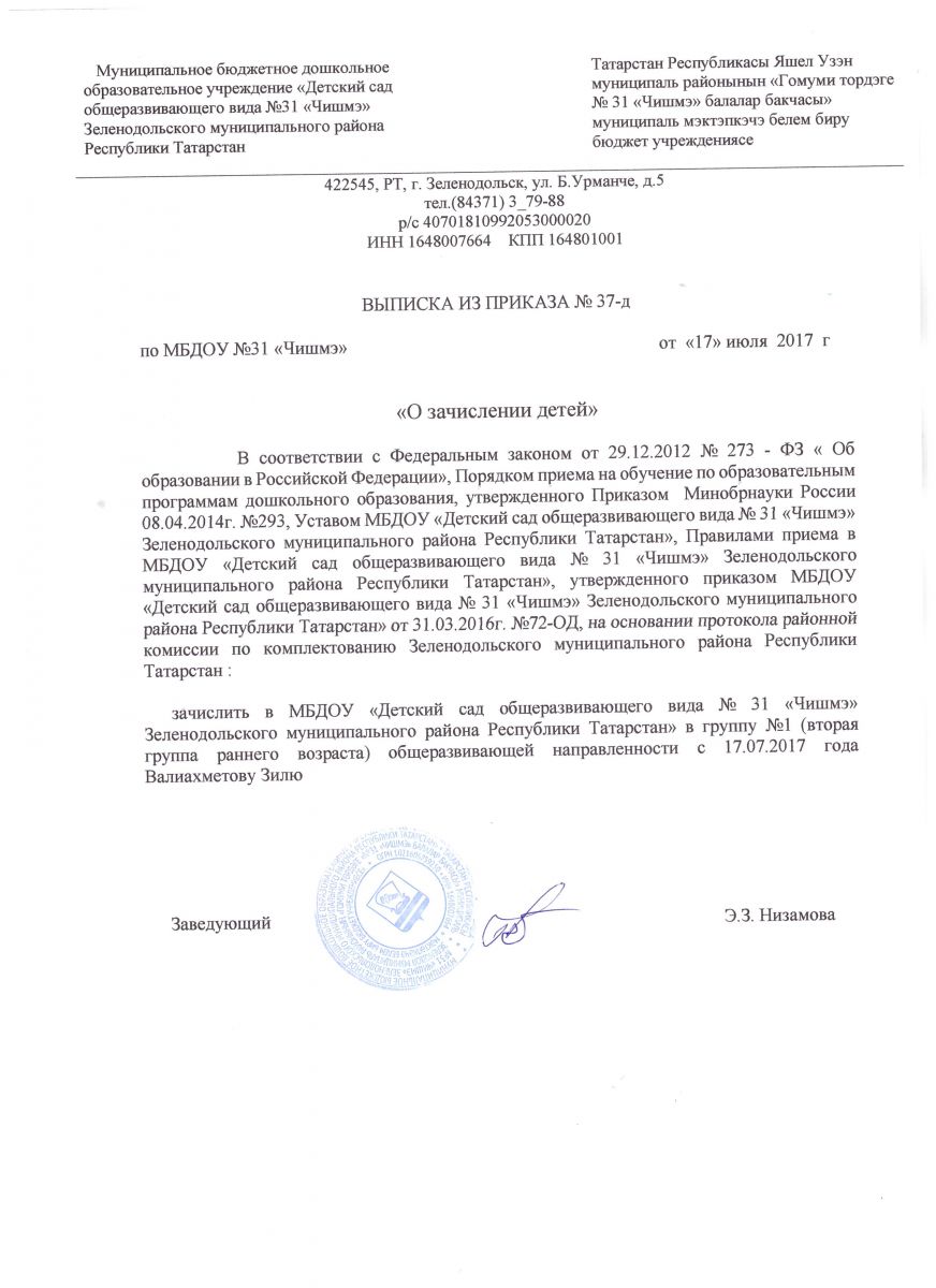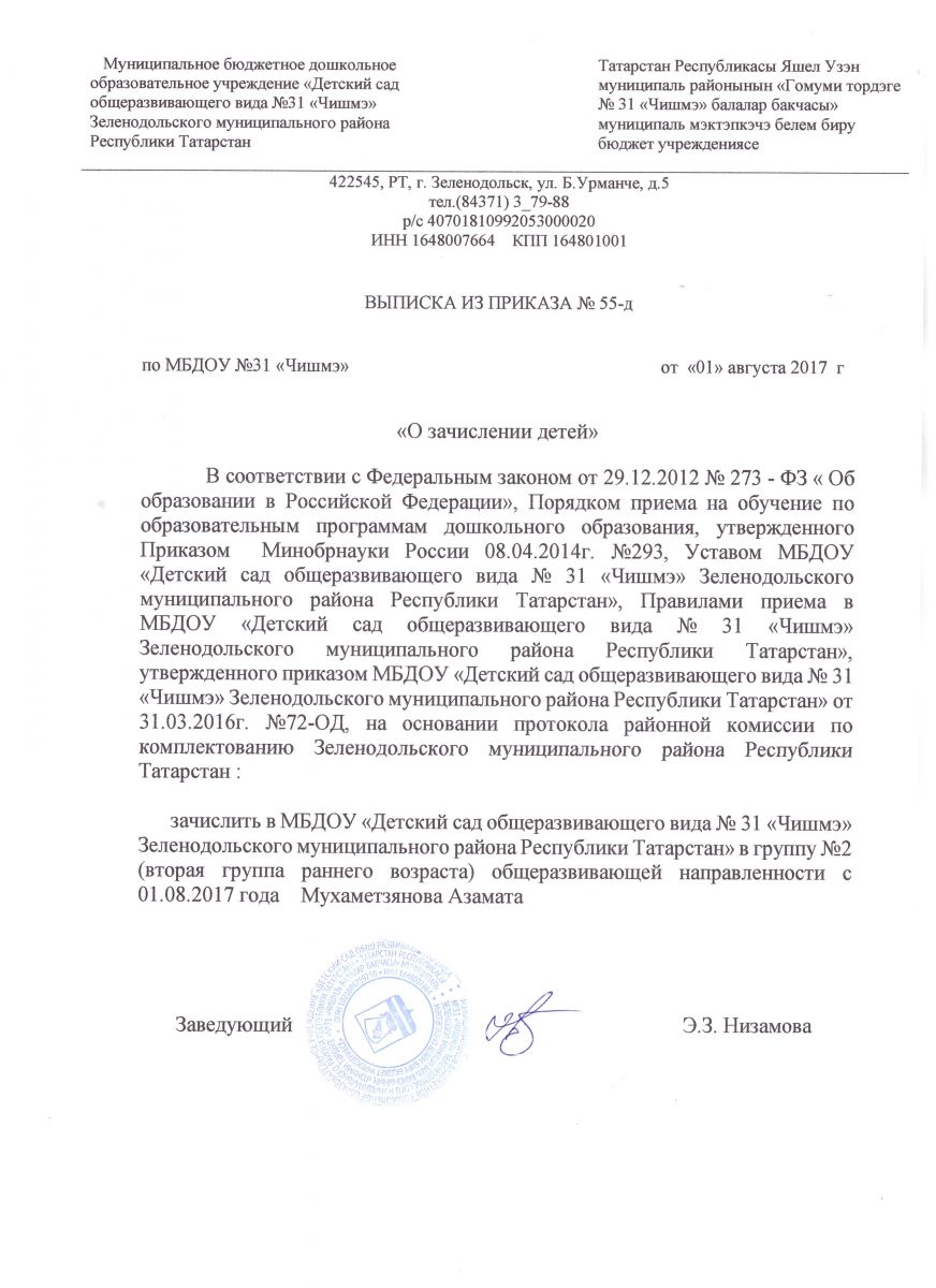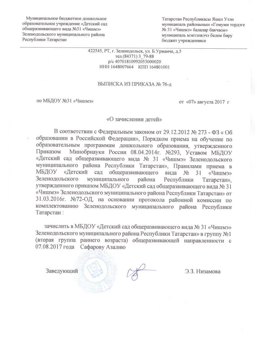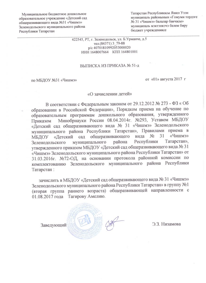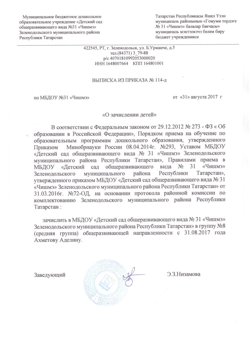 Выписка из приказа о зачислении Ахметшиной Азалии