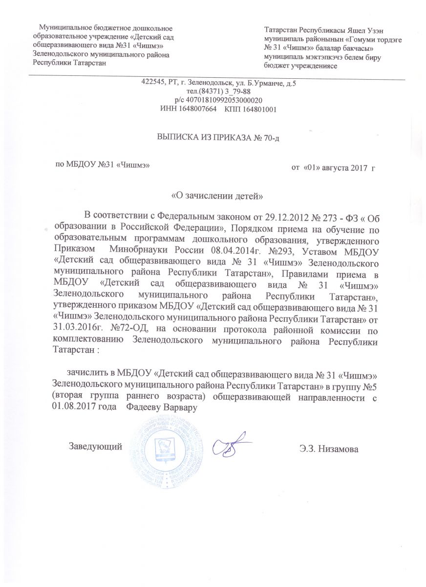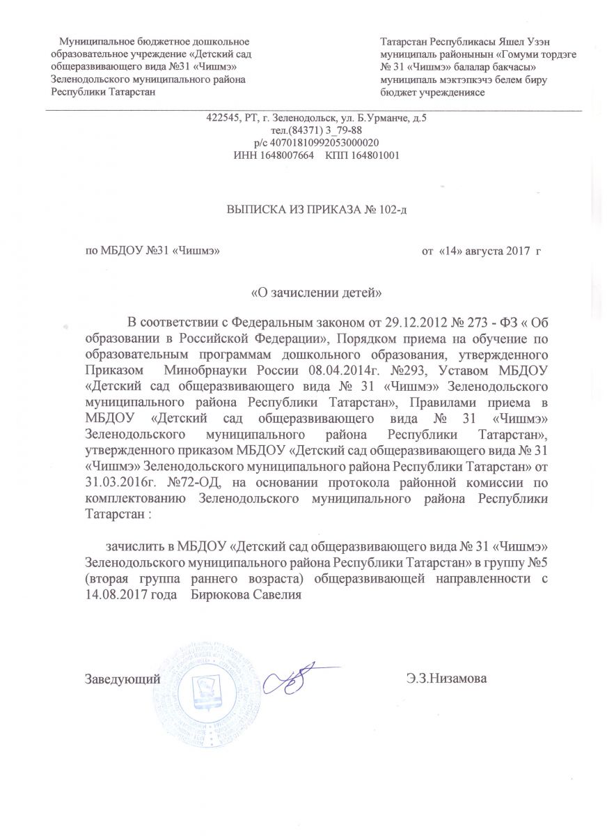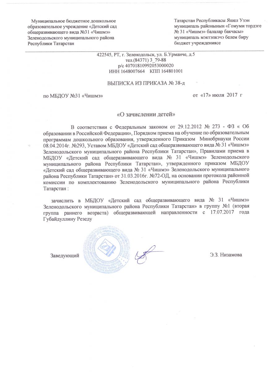 Выписка из приказа о зачислении Губайдуллиной Резеды