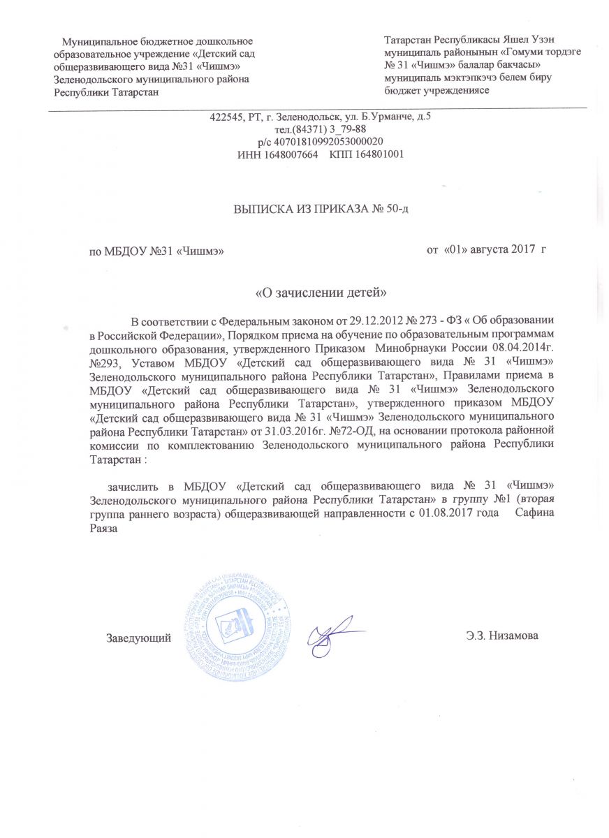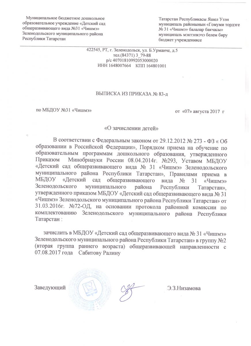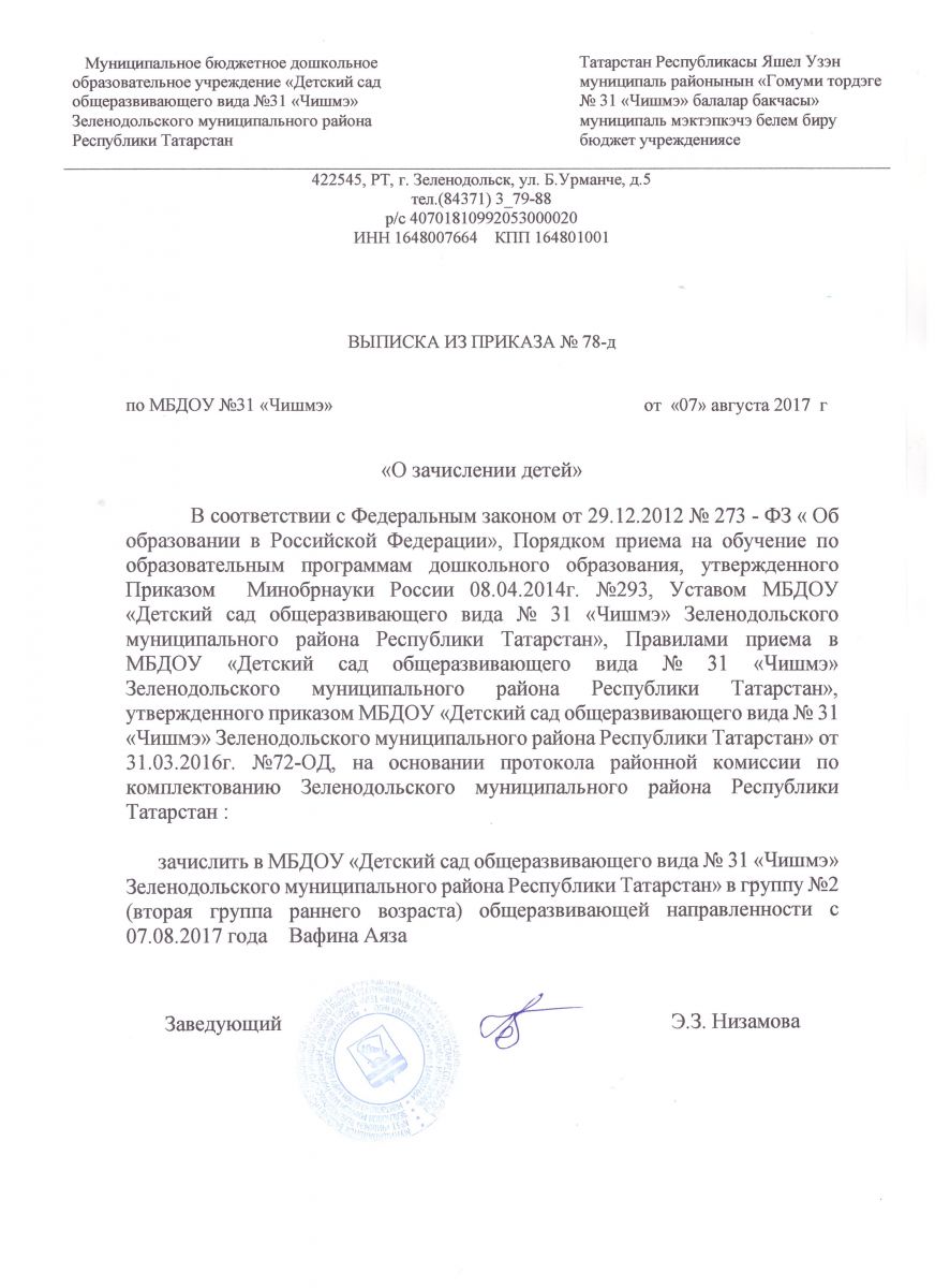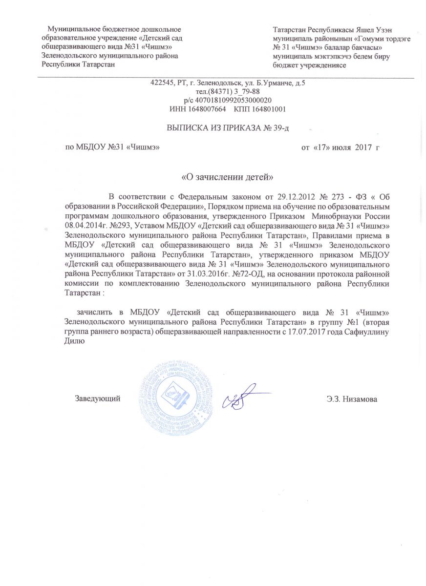 Выписка из приказа о зачислении Сафиуллиной Дили