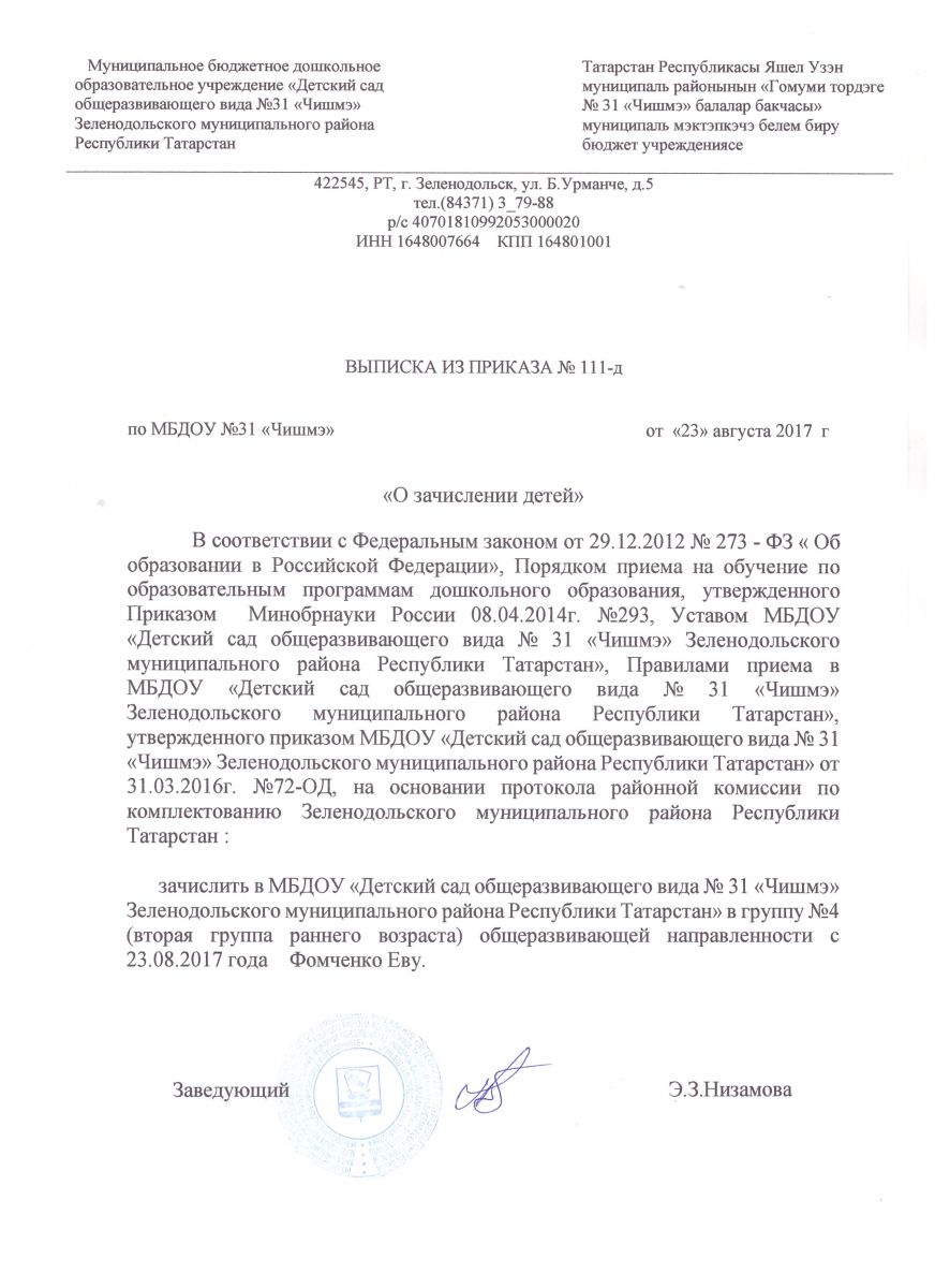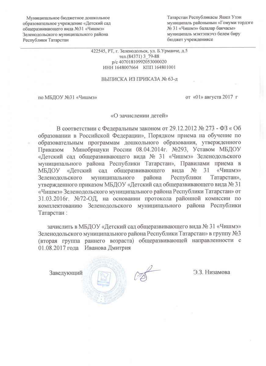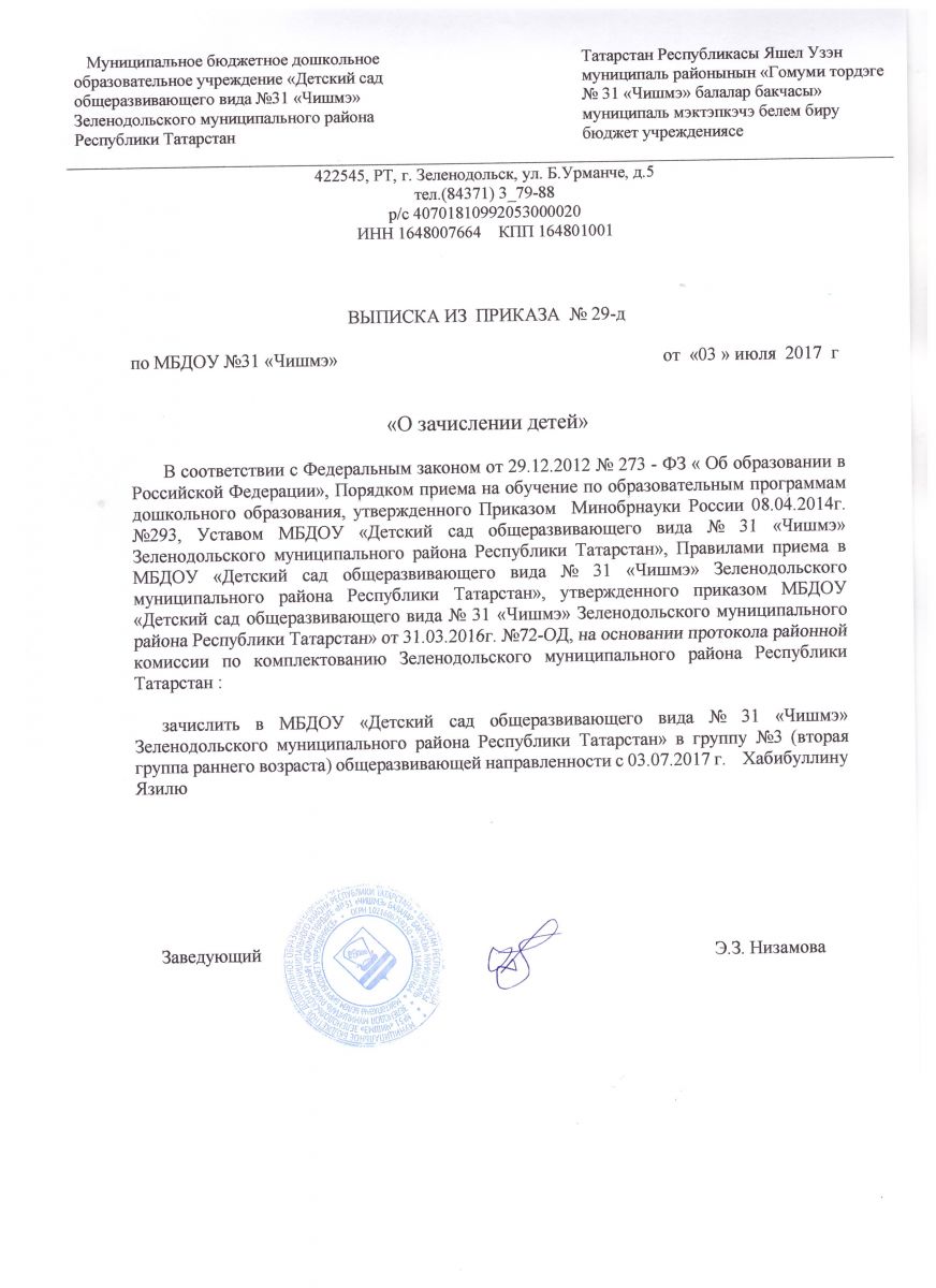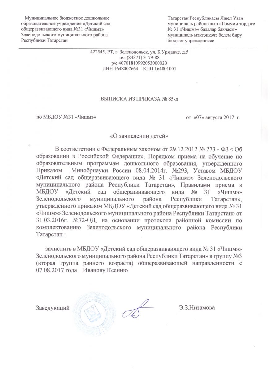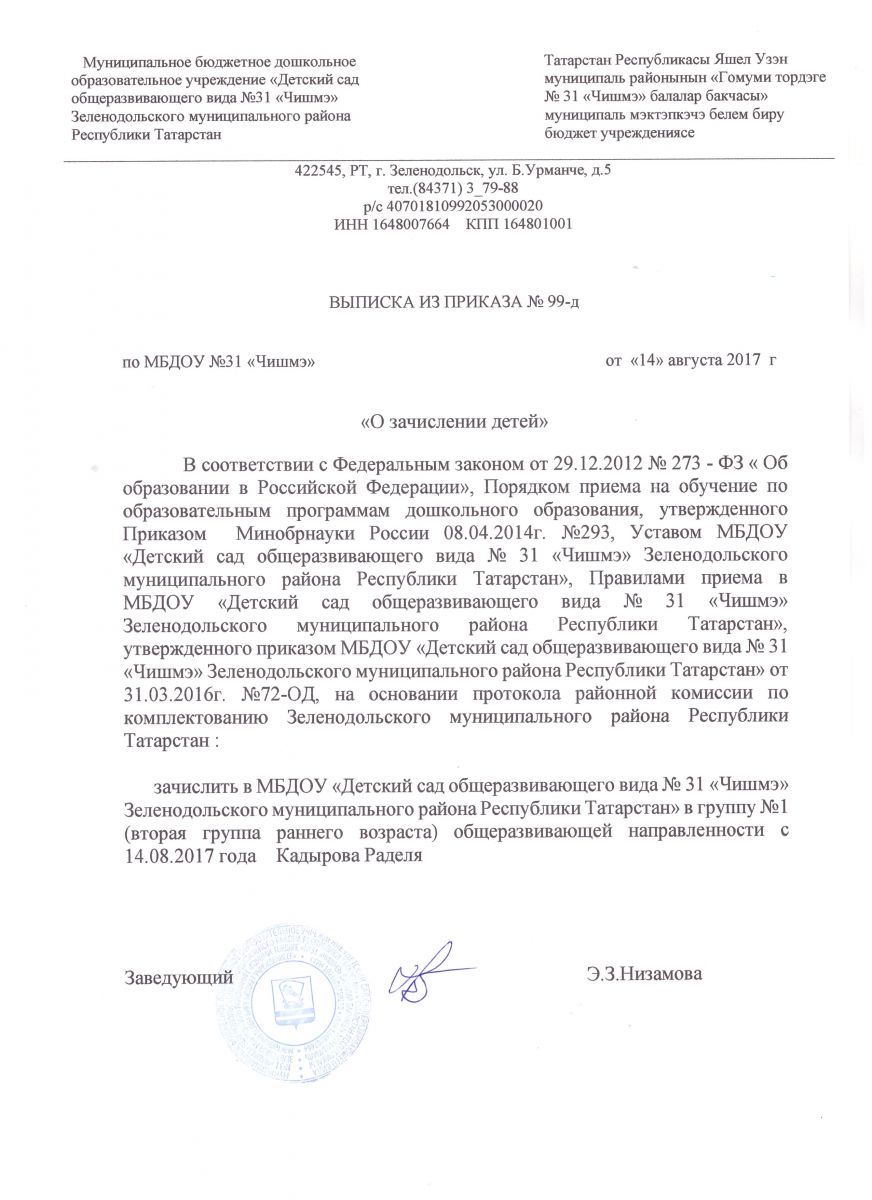 Выписка из приказа о зачислении Сафиуллиной Дили