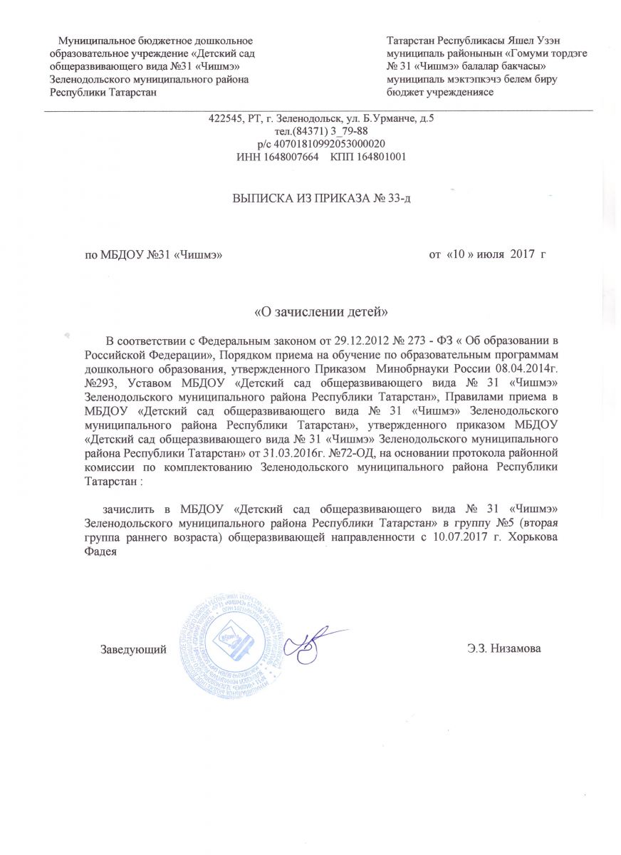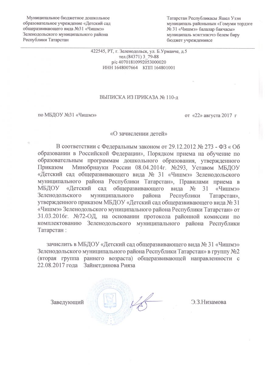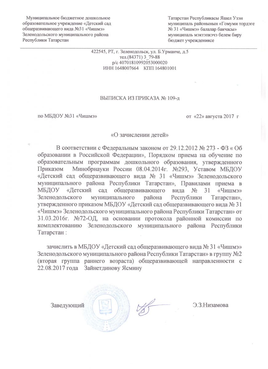 Выписка из приказа о зачислении Зайнетдиновой Ясмины