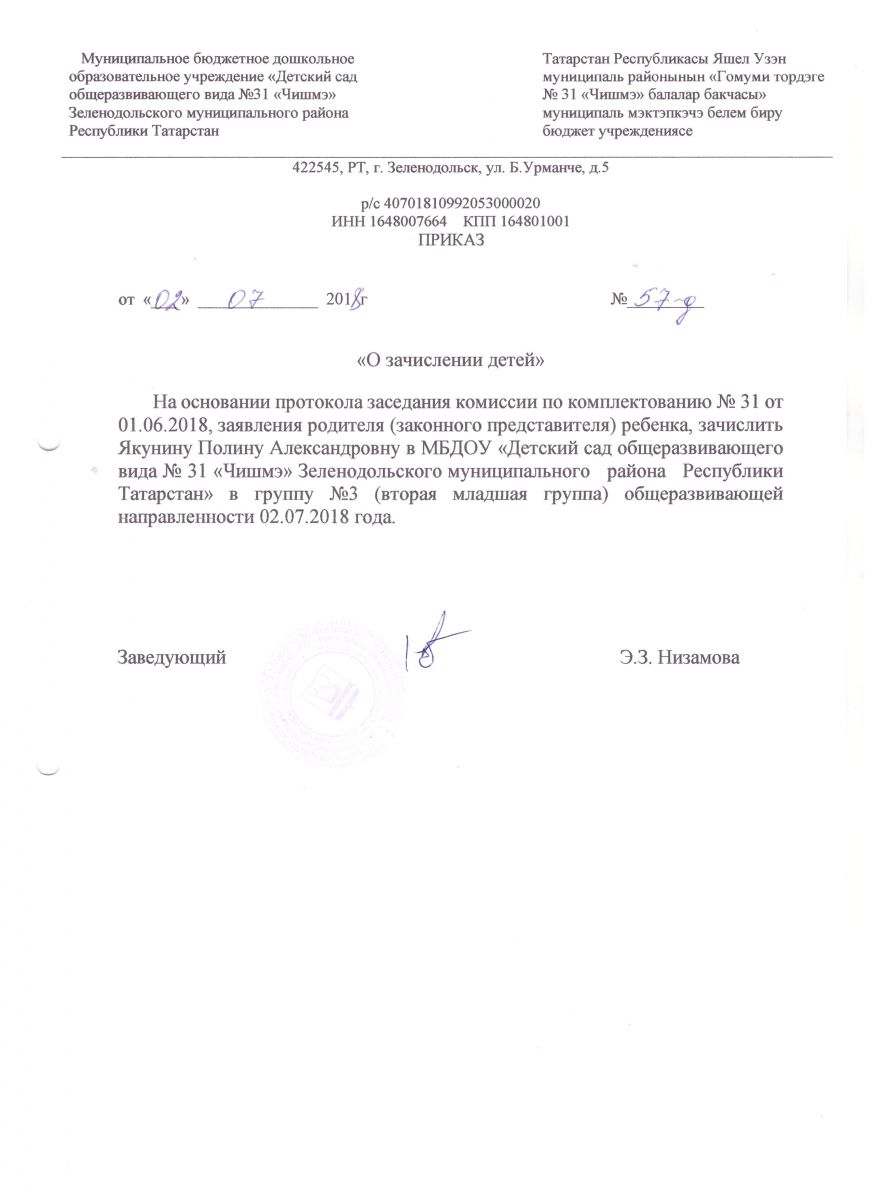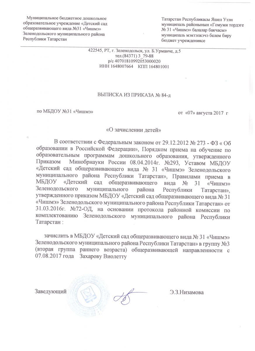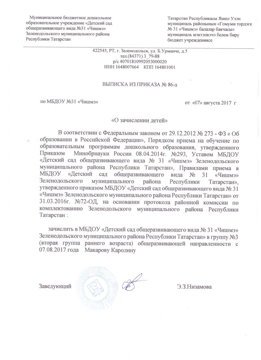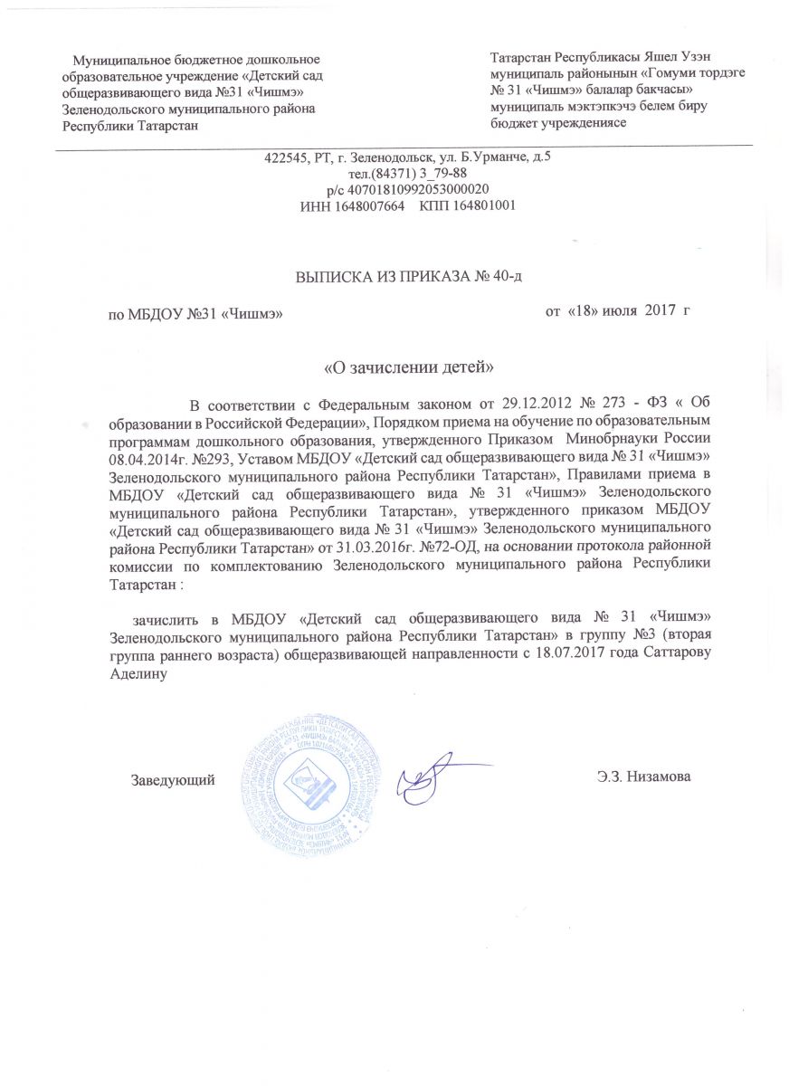 Выписка из приказа о зачислении Зайнетдиновой Ясмины