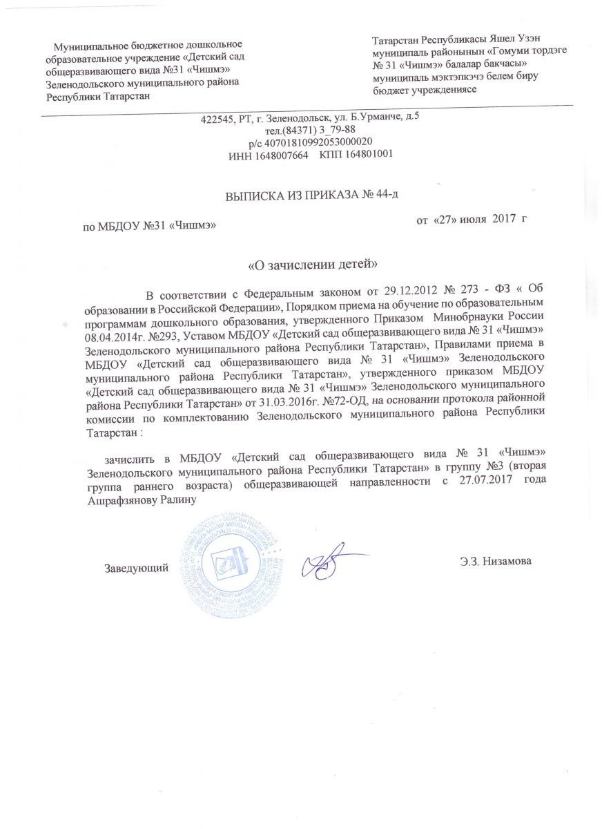 Выписка из приказа о зачислении Ашрафзяновой Ралины