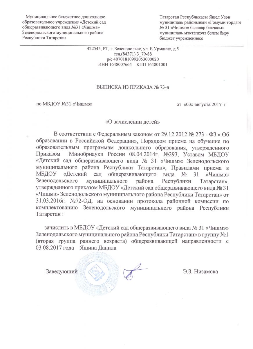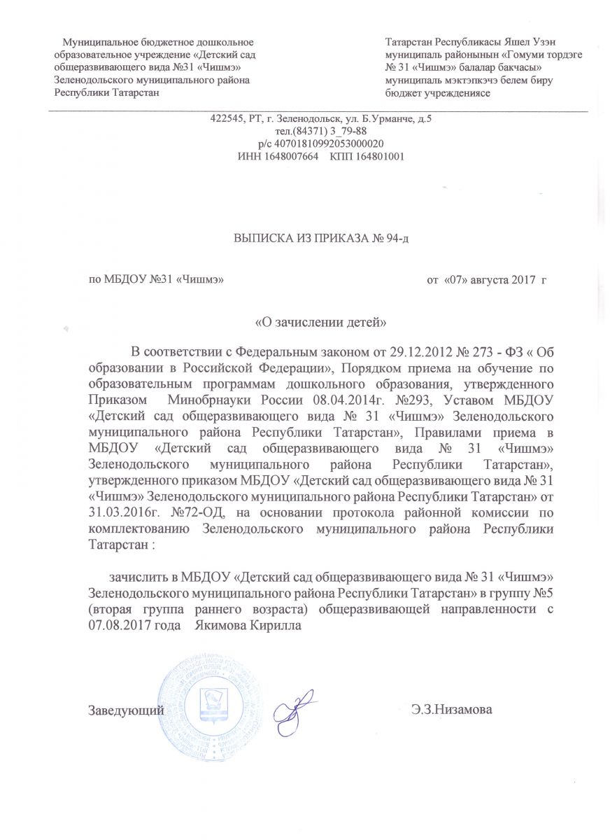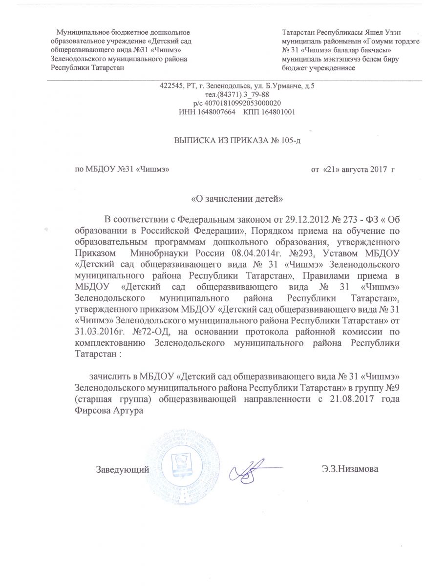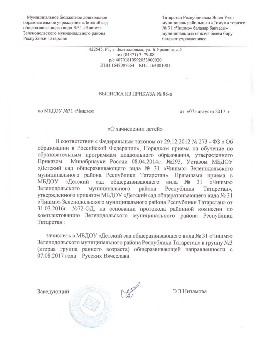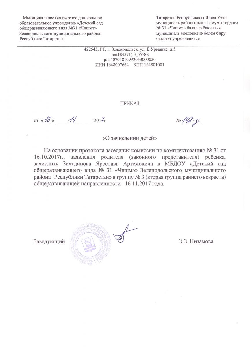 Выписка из приказа о зачислении Зиятдинова Ярослава