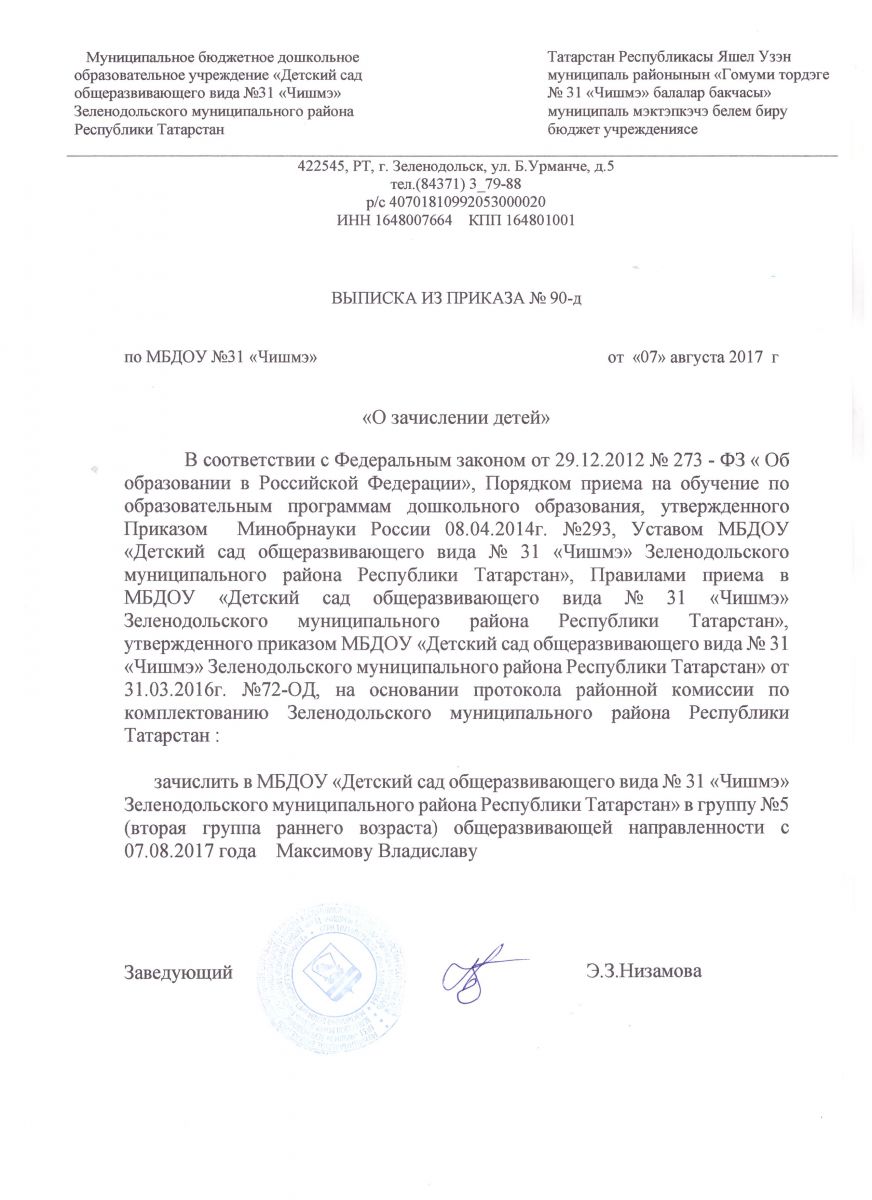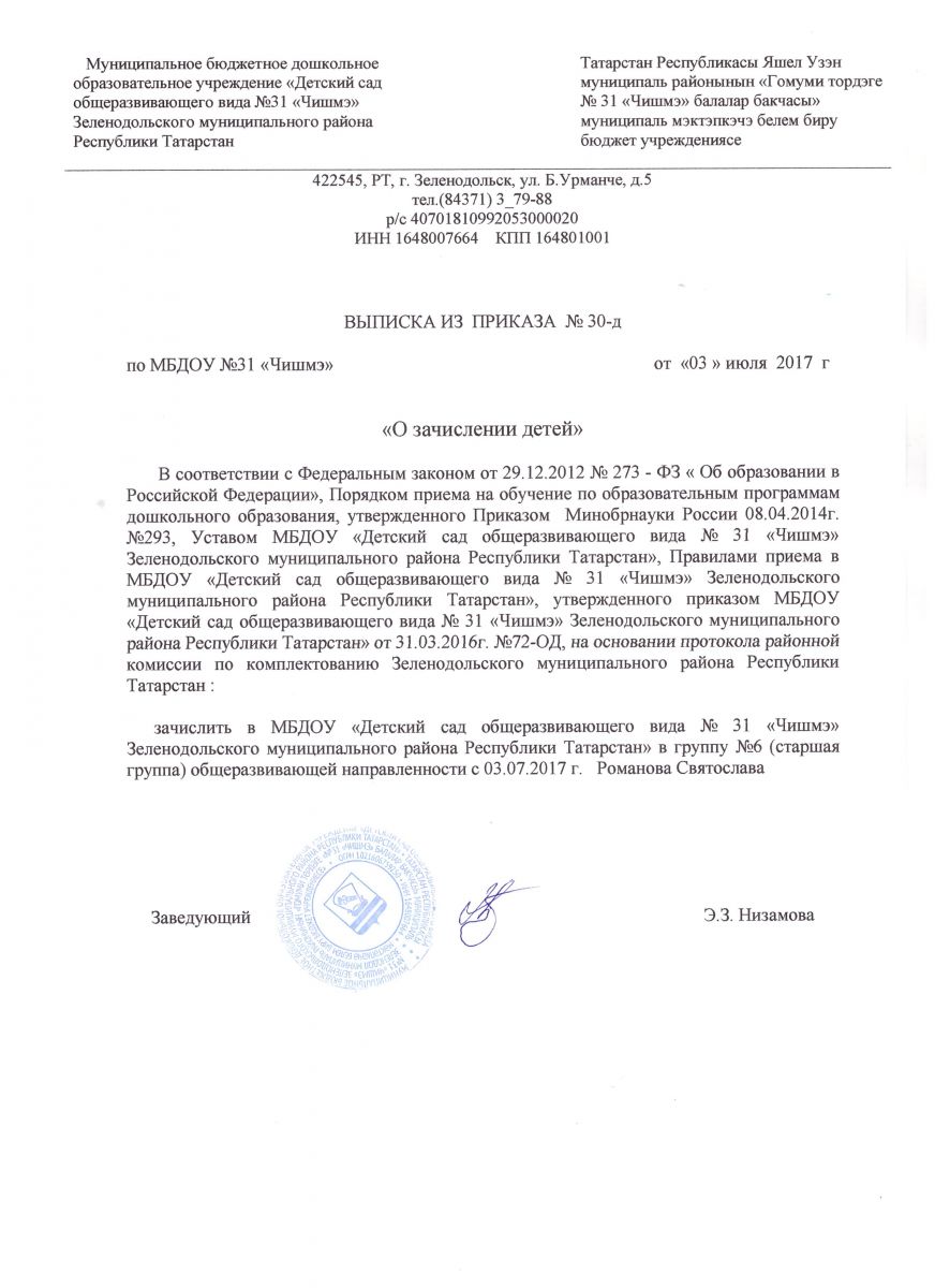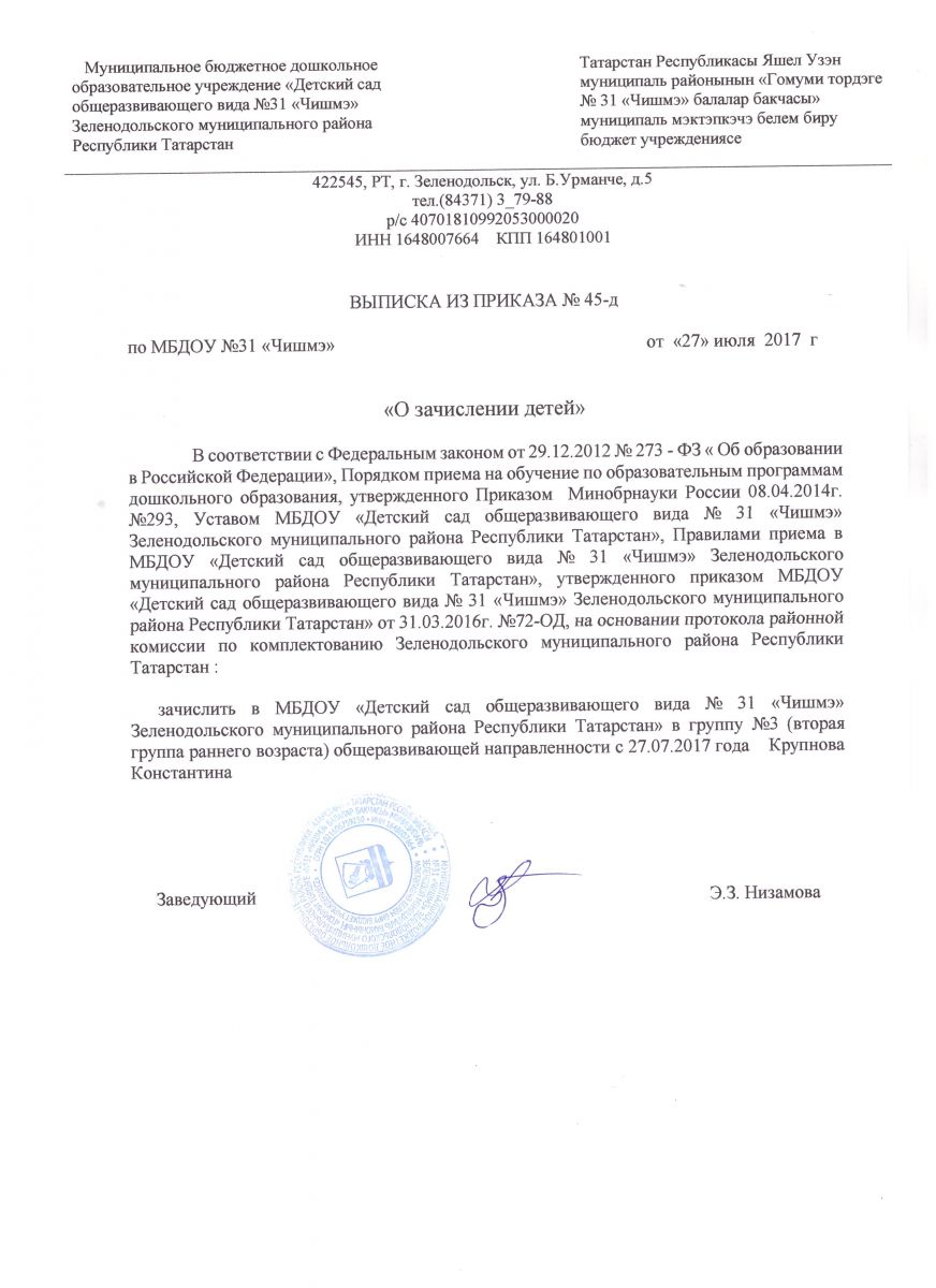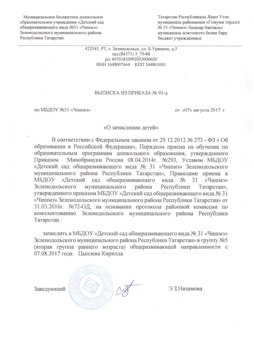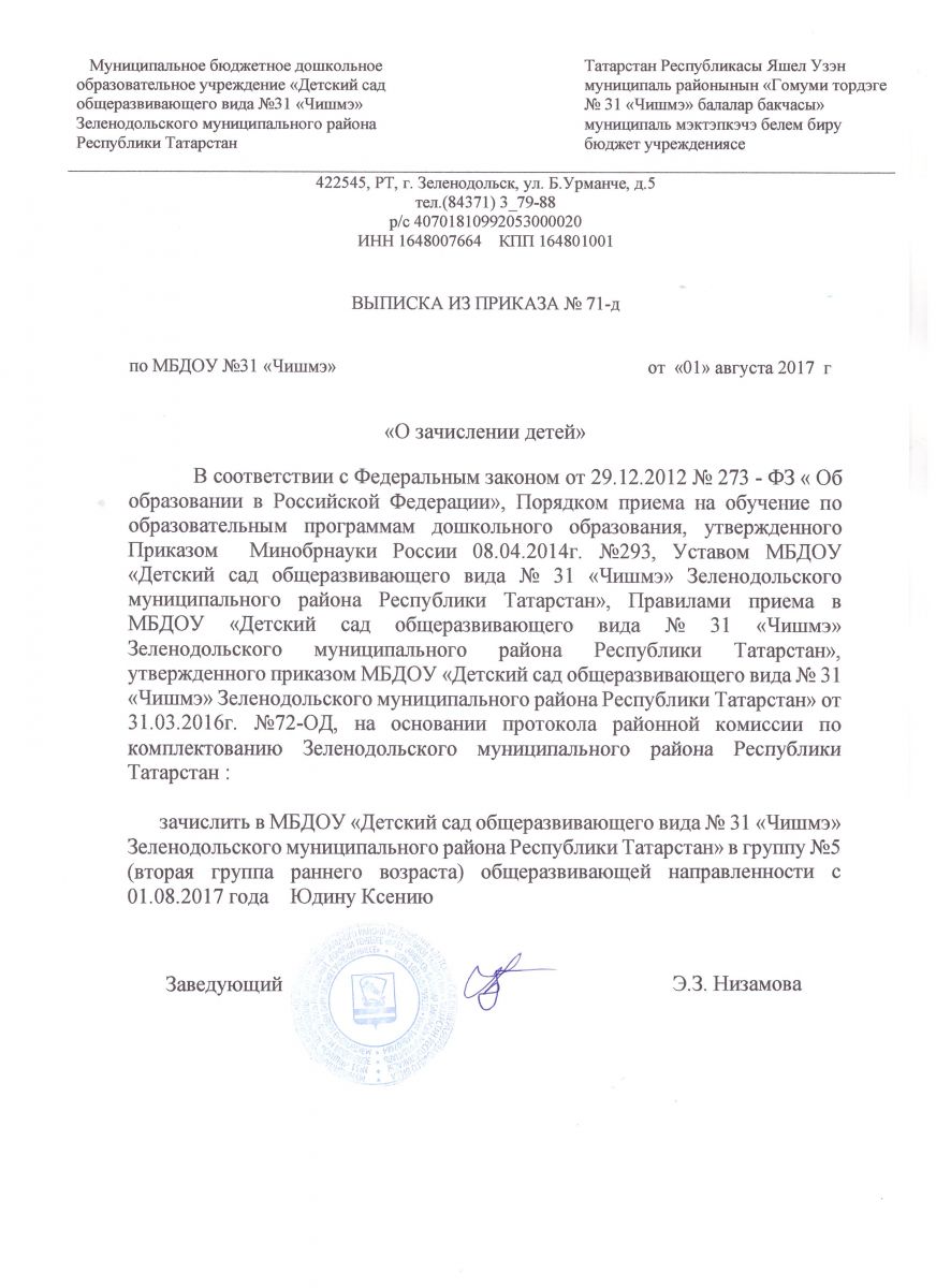Выписка из приказа о зачислении Зиятдинова Ярослава