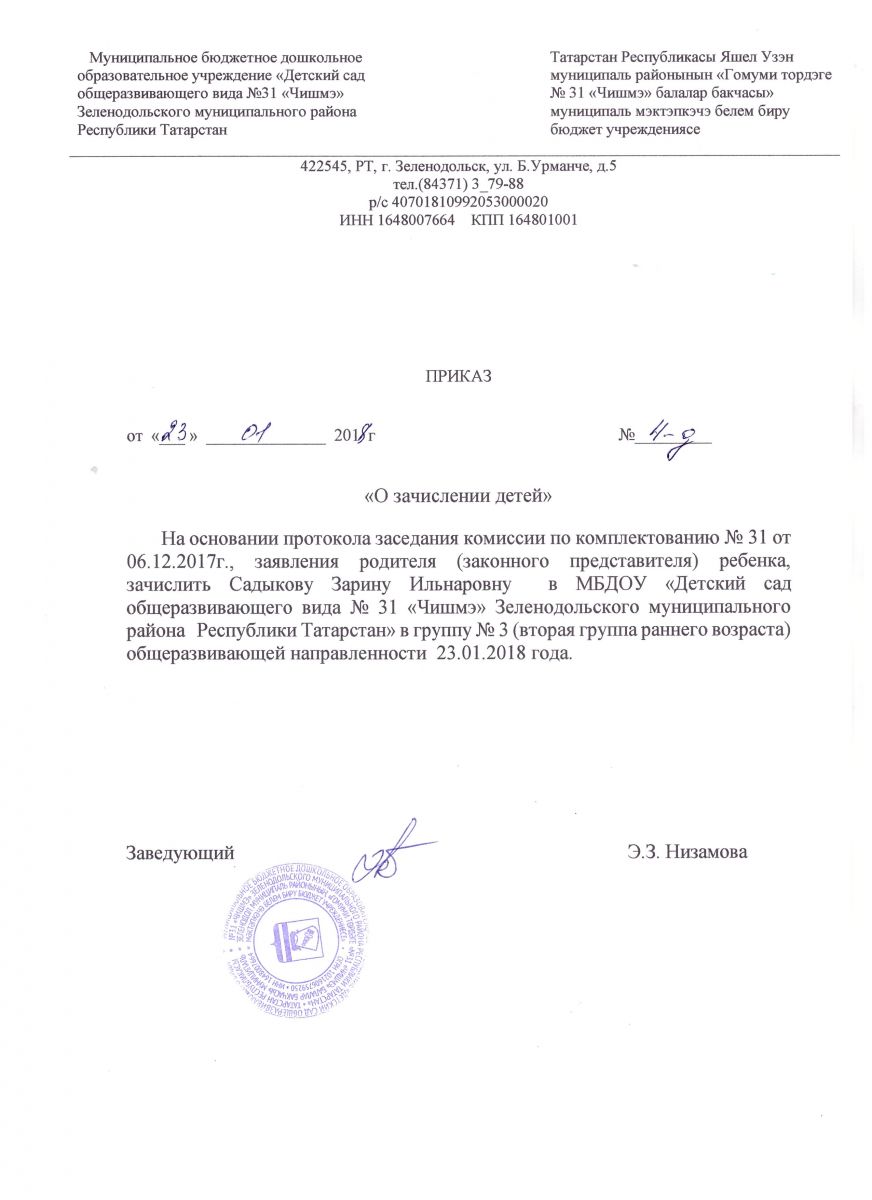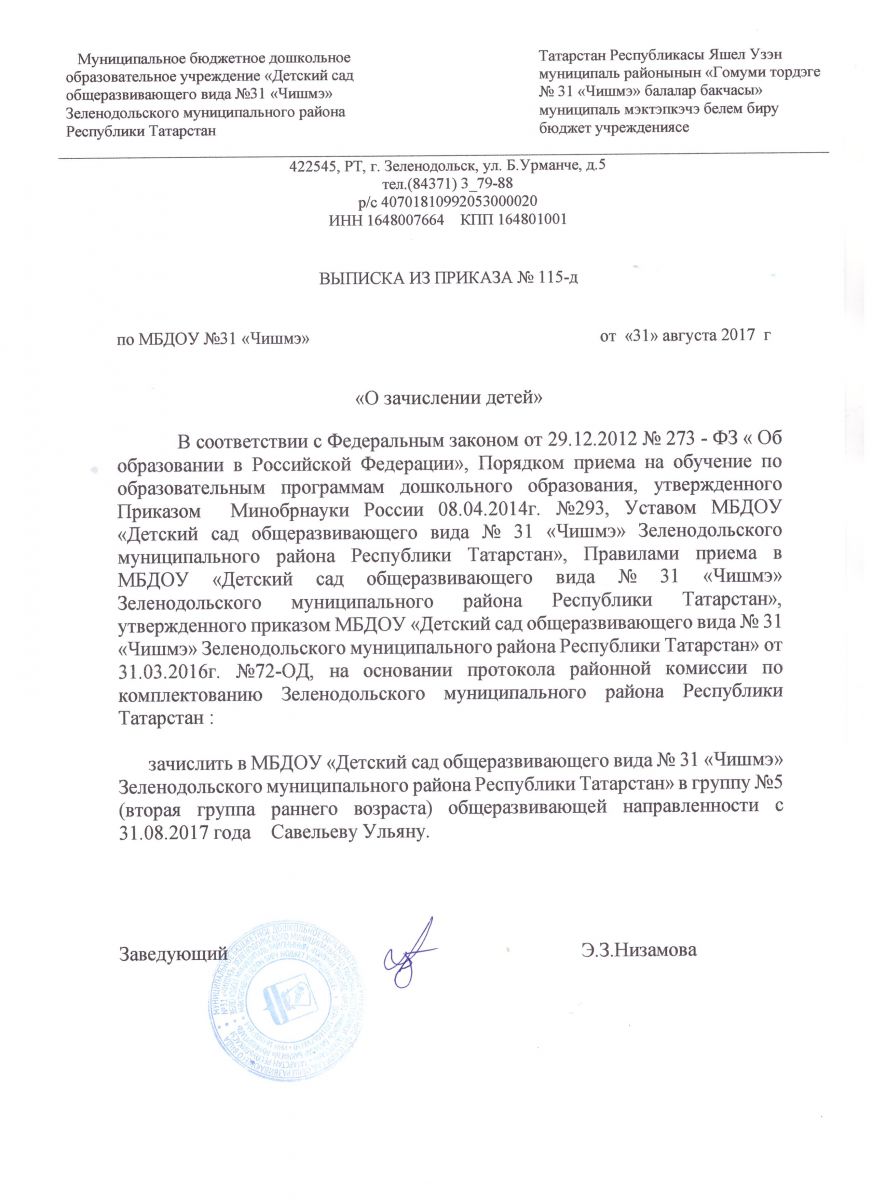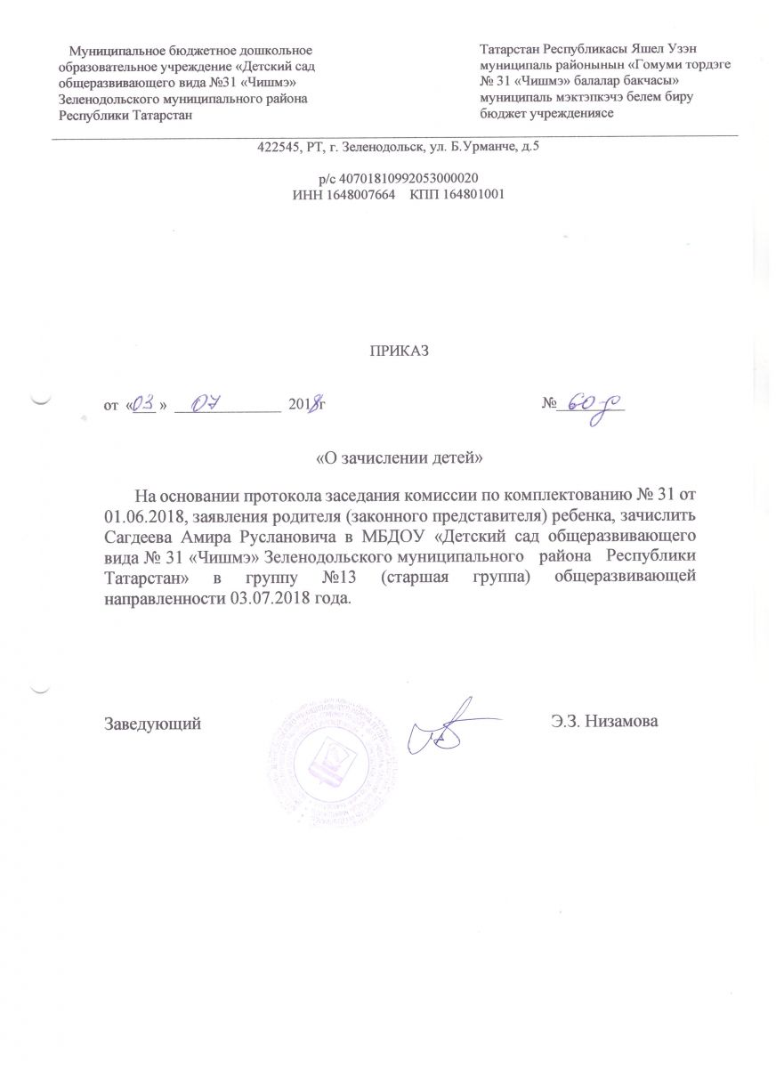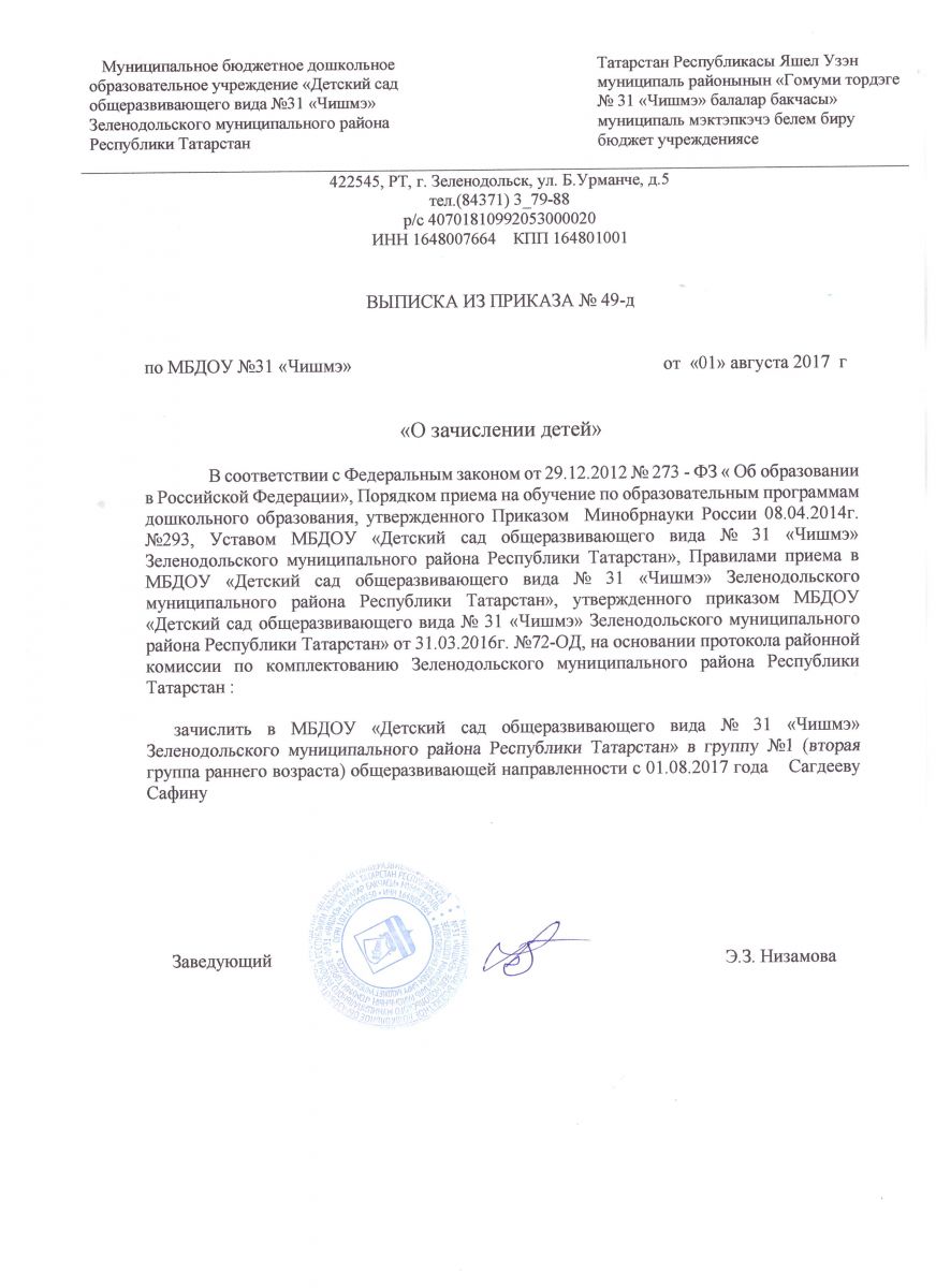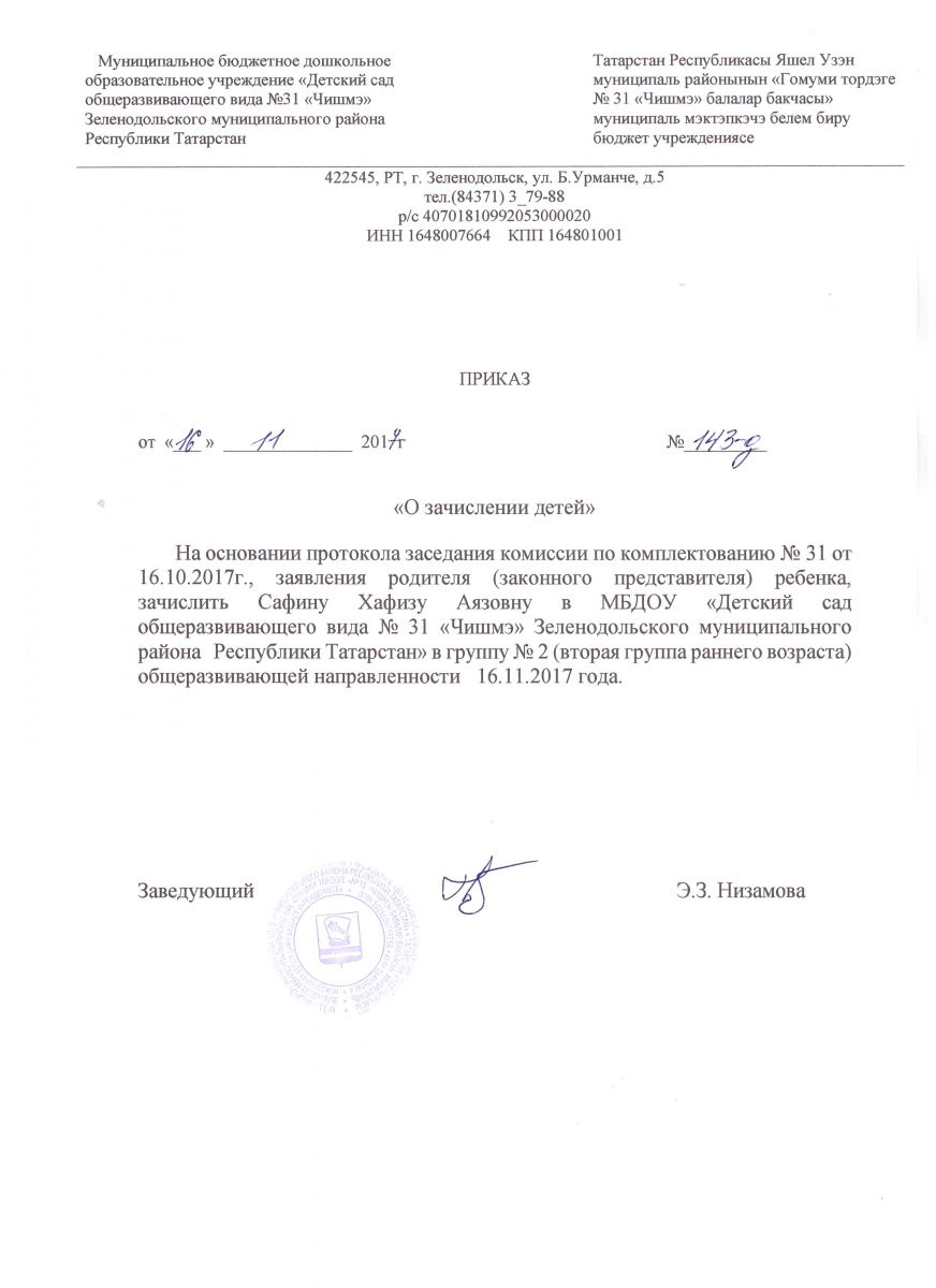 Выписка из приказа о зачислении Сагдеевой Сафины
