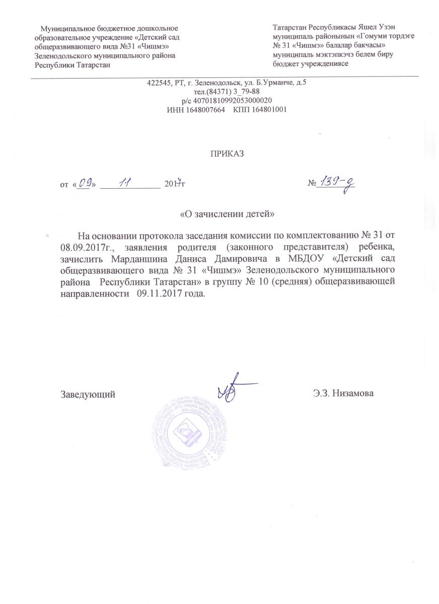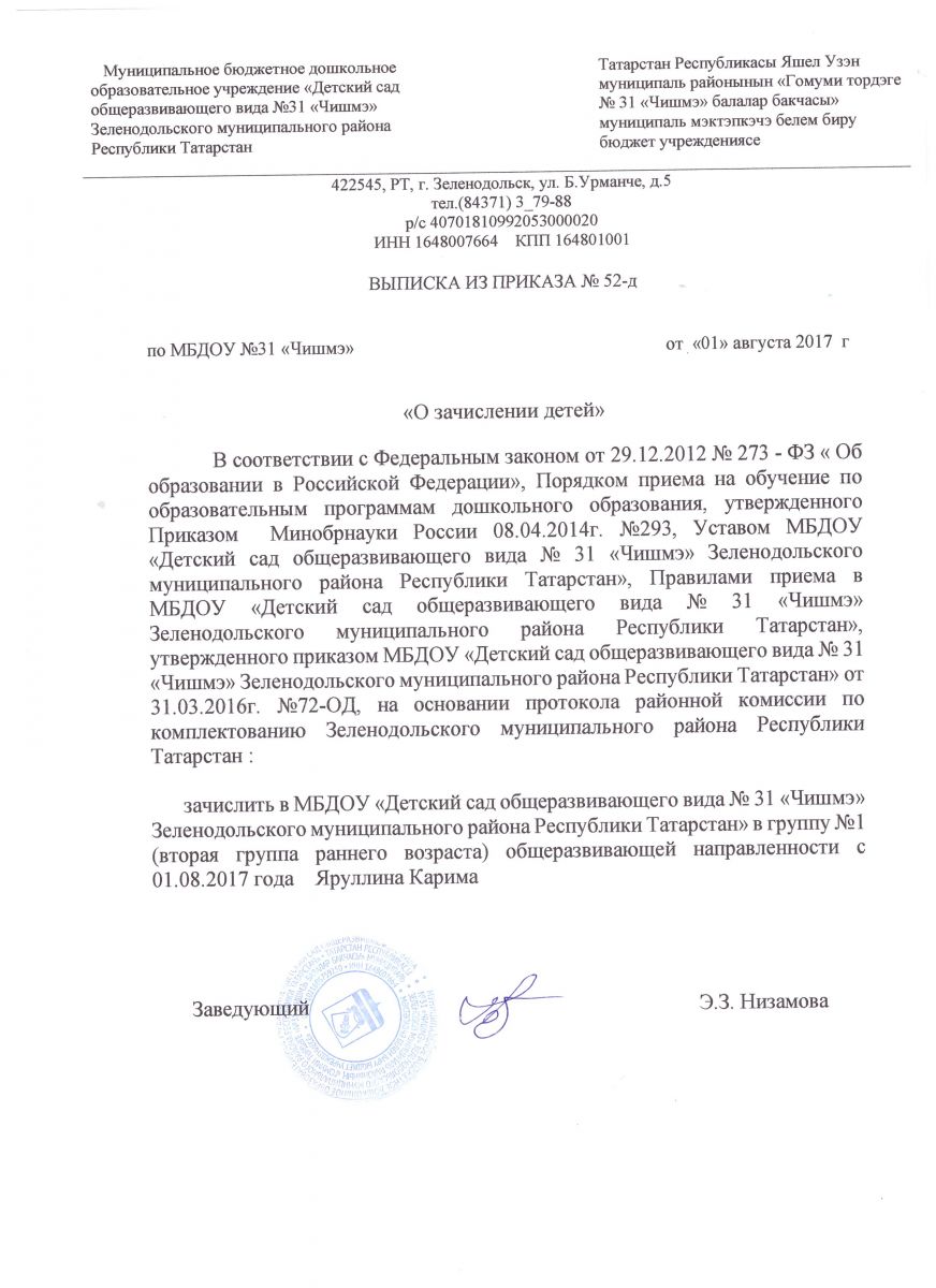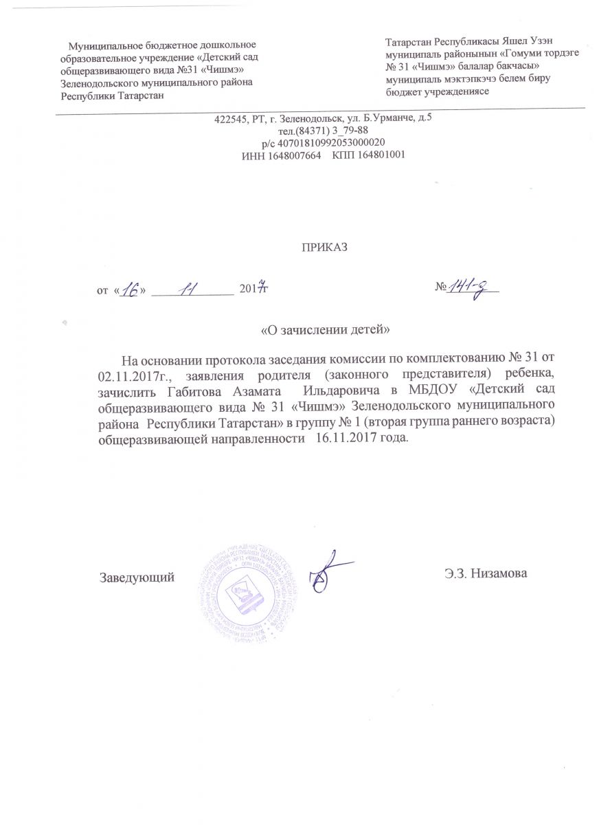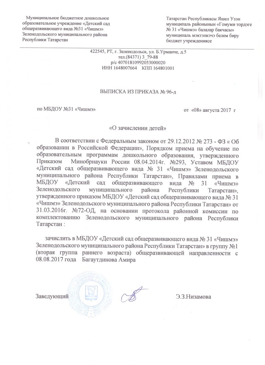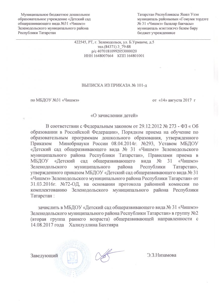 Выписка из приказа о зачислении Гиниятуллину Малику