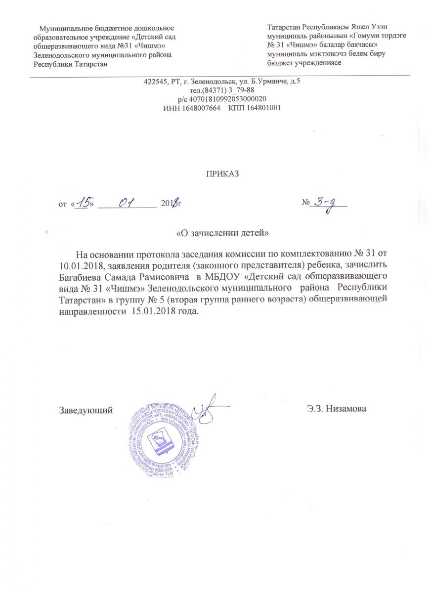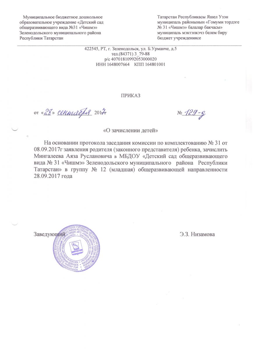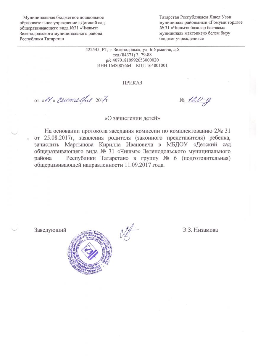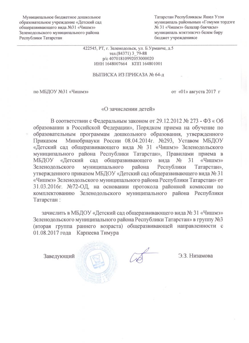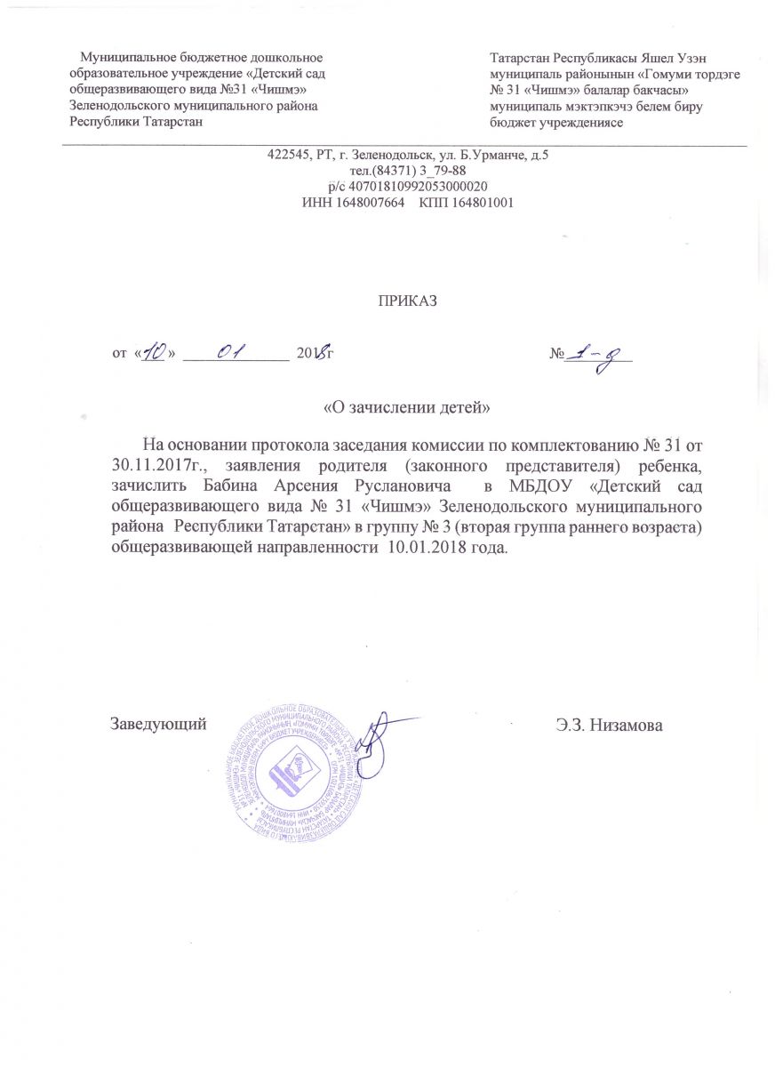 Выписка из приказа о зачислении Гиниятуллину Малику