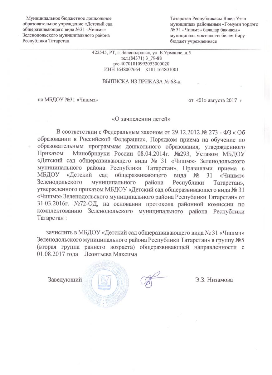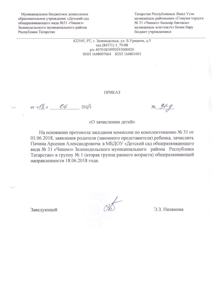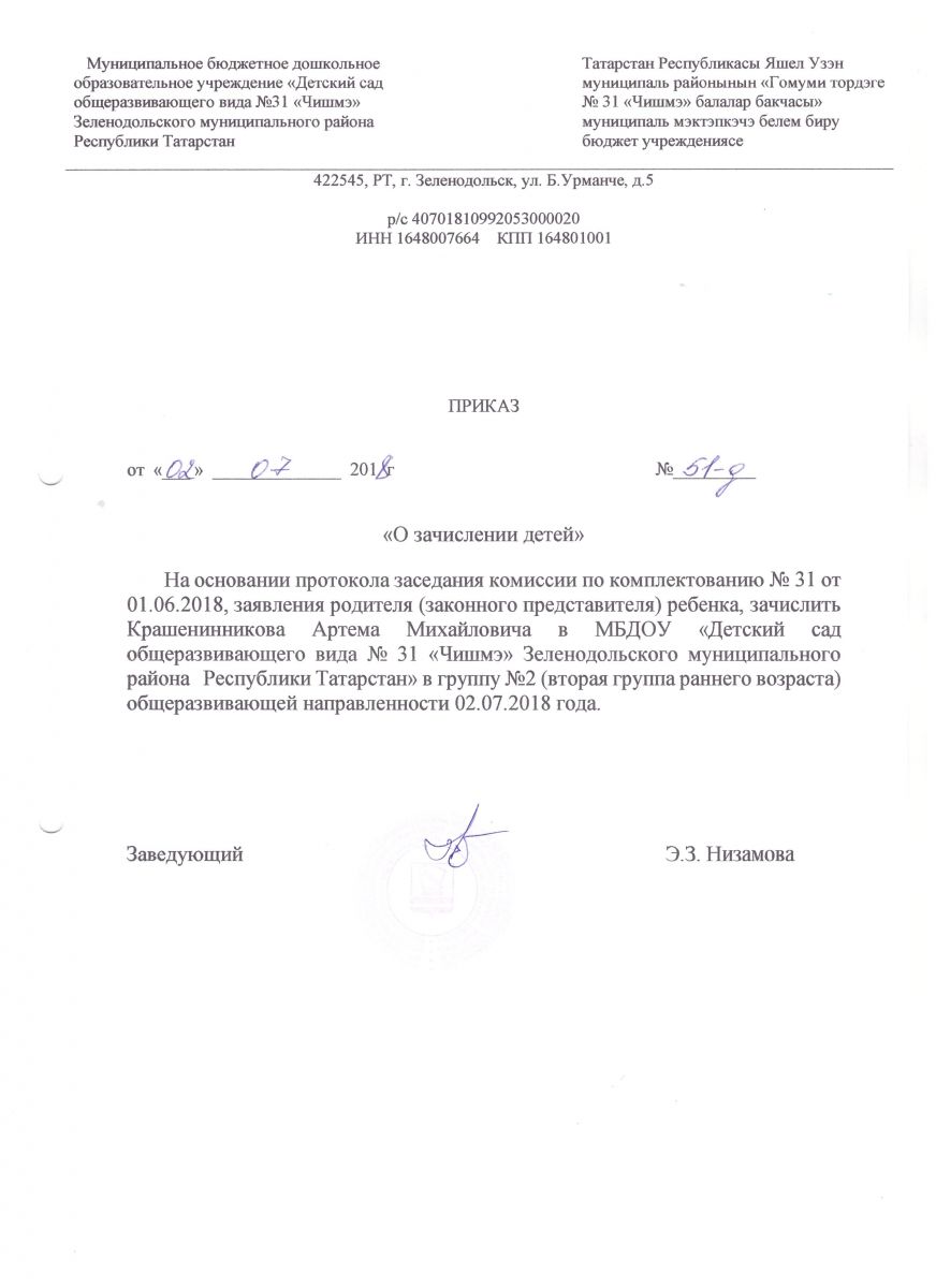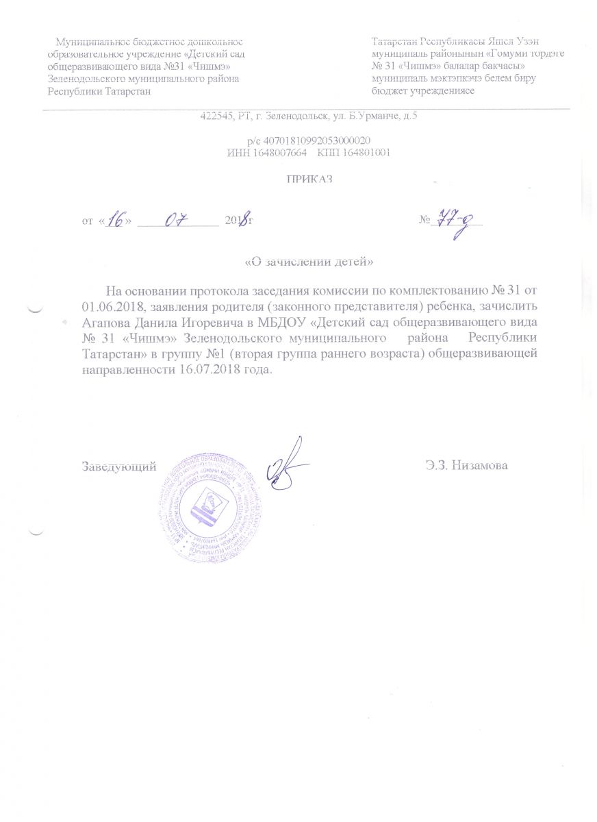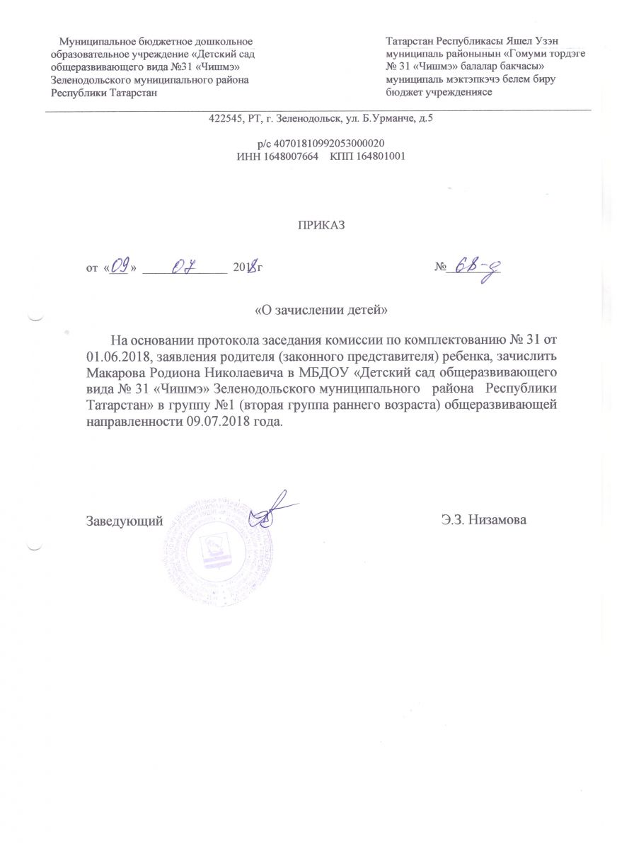 Выписка из приказа о зачислении Гиниятуллину Малику