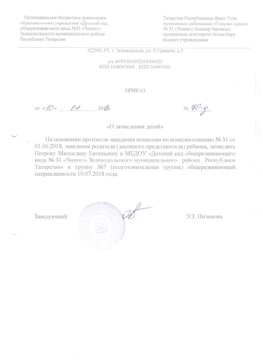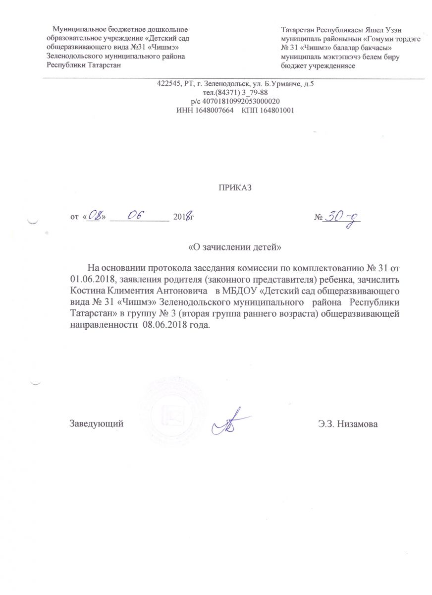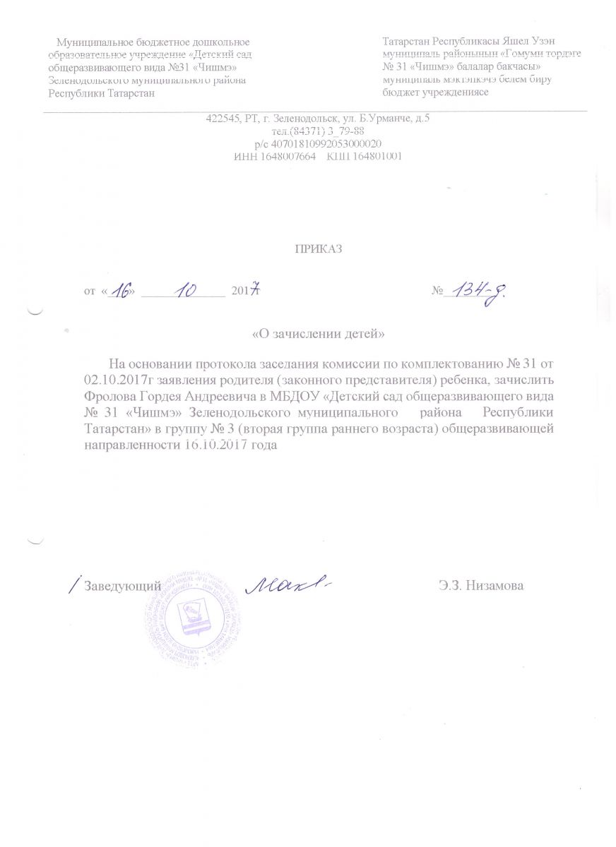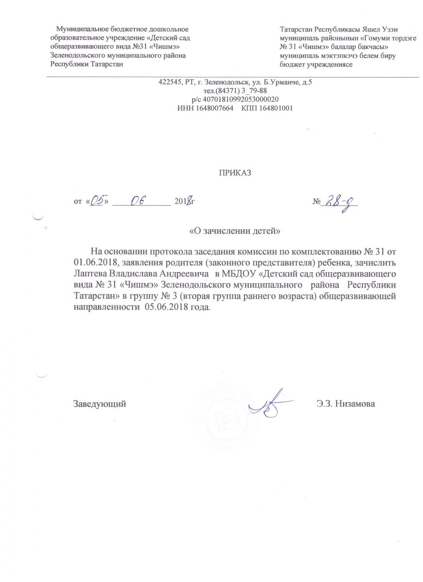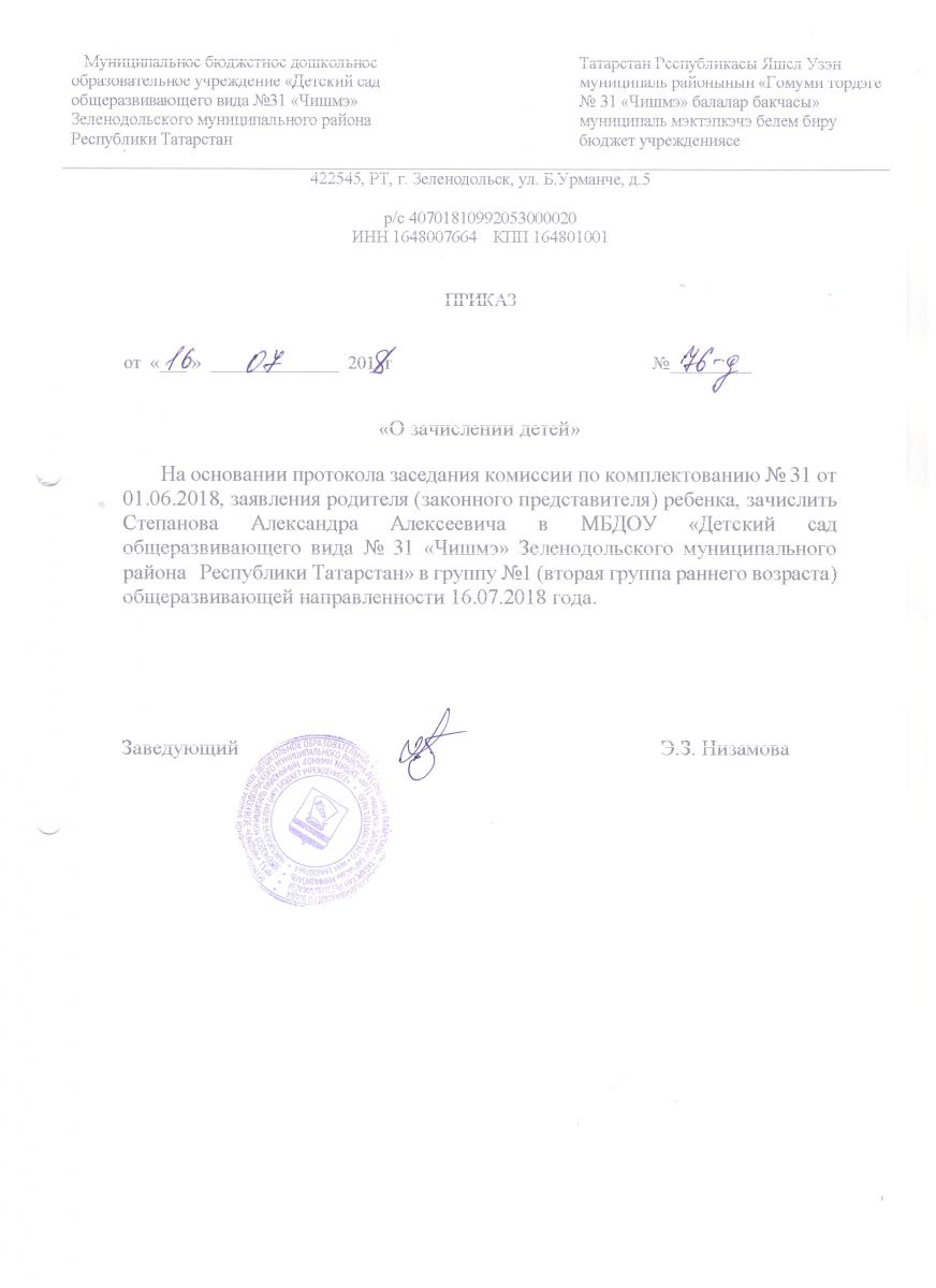 Выписка из приказа о зачислении Гиниятуллину Малику