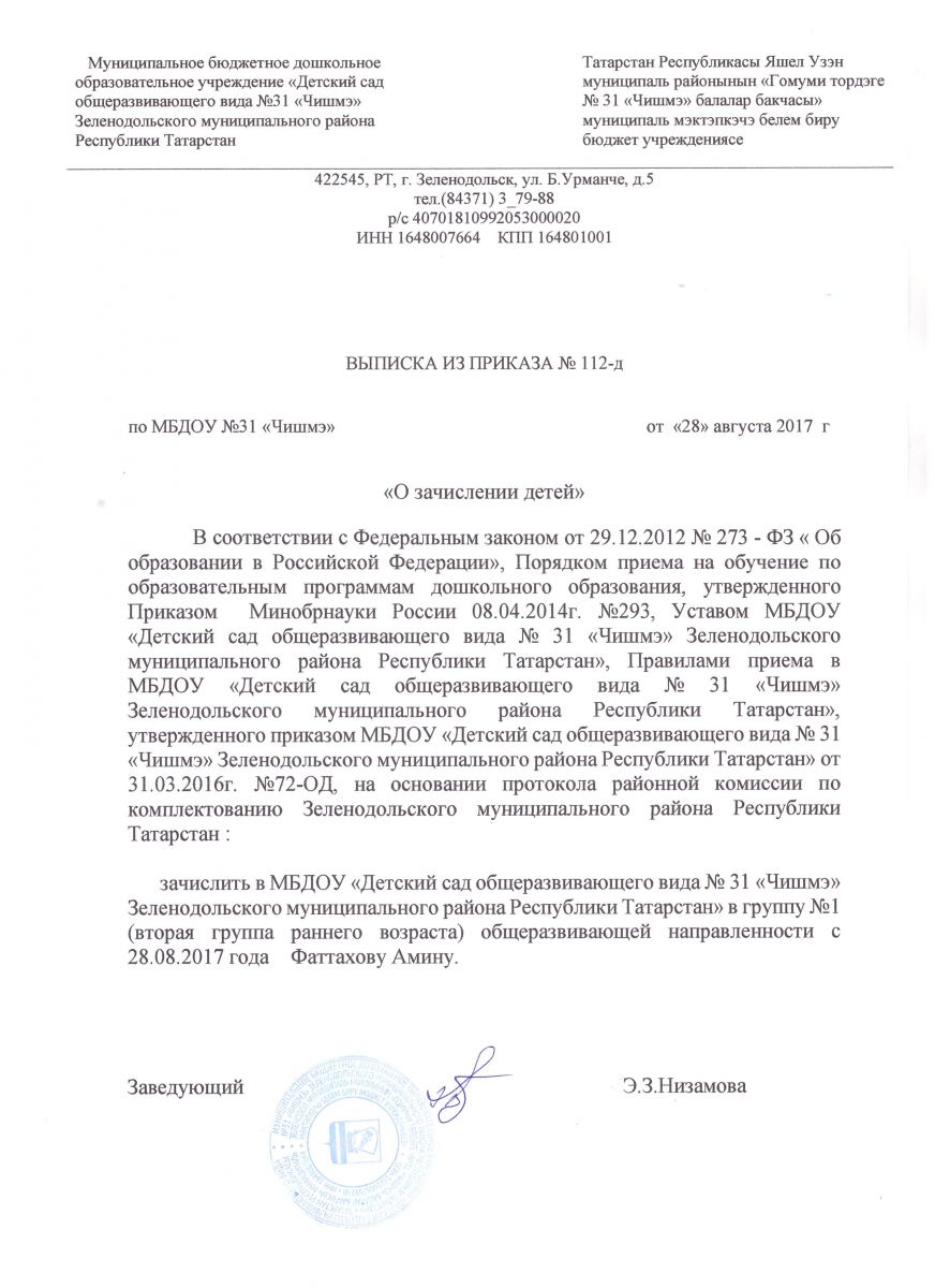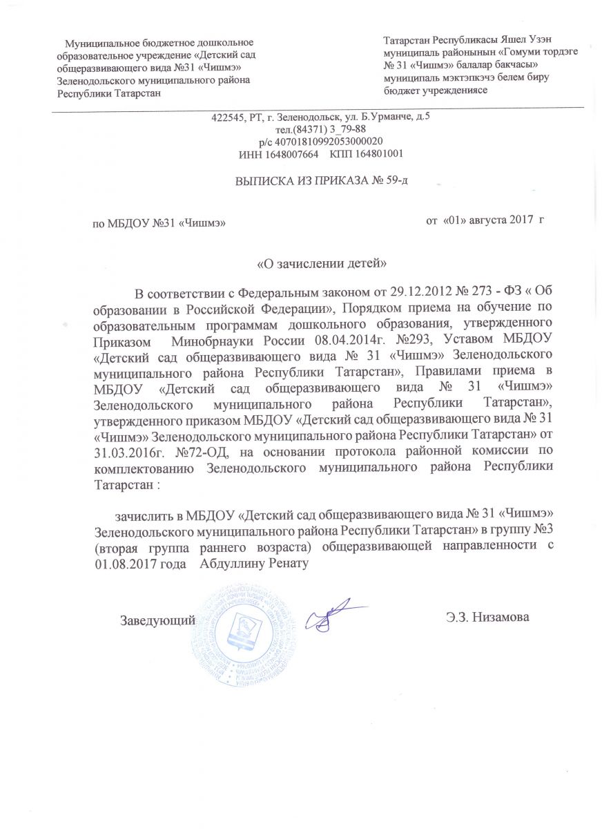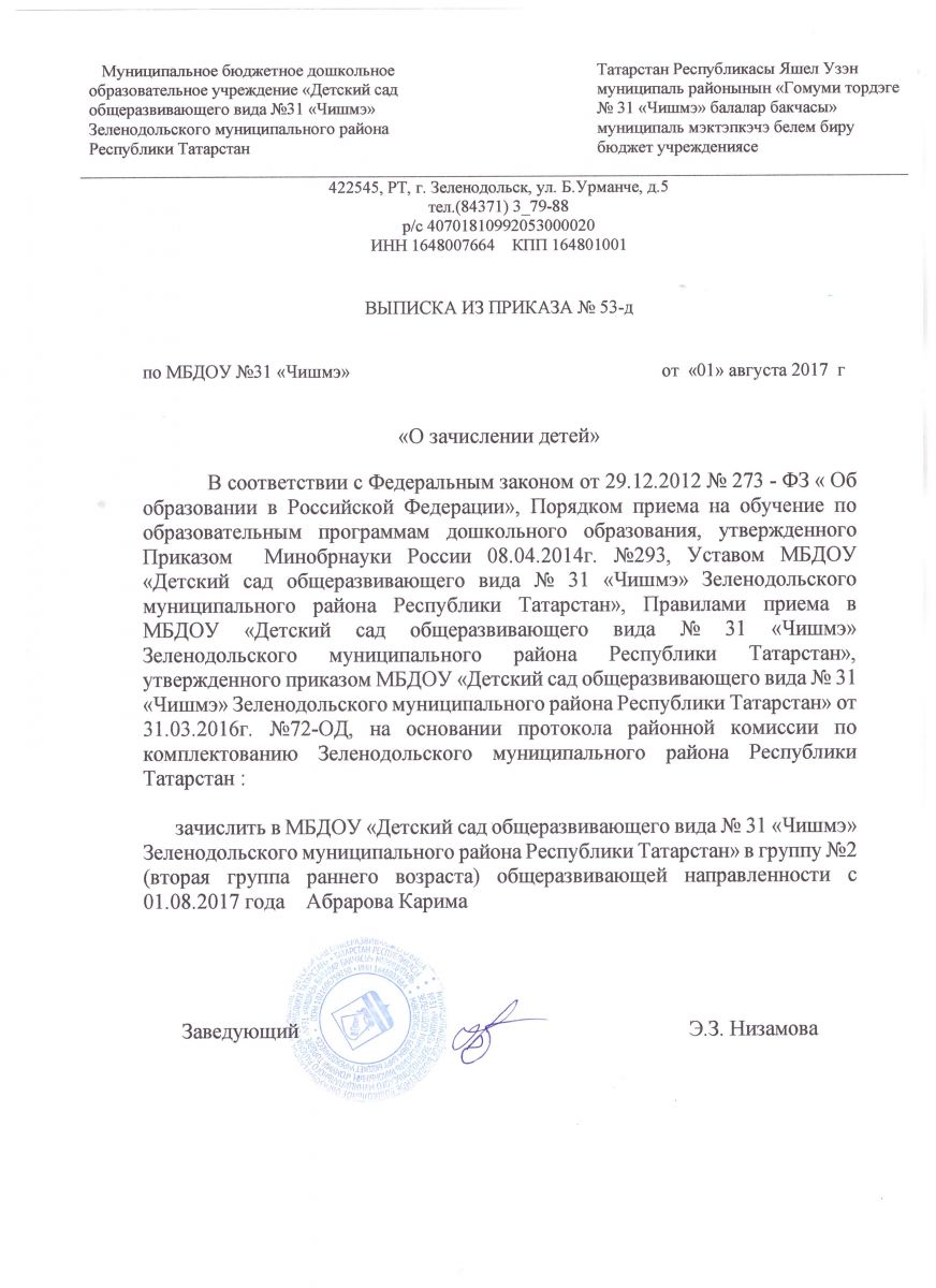 Выписка из приказа о зачислении Абдуллиной Ренаты