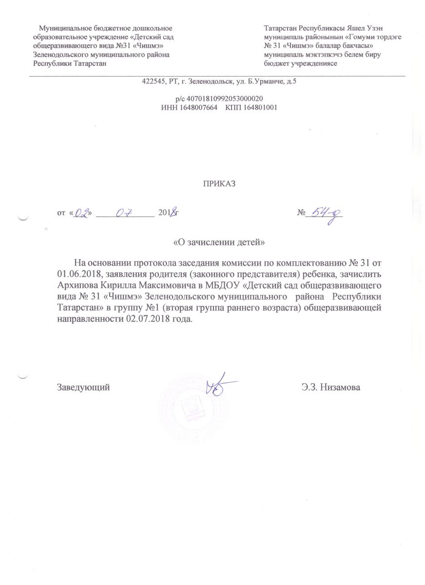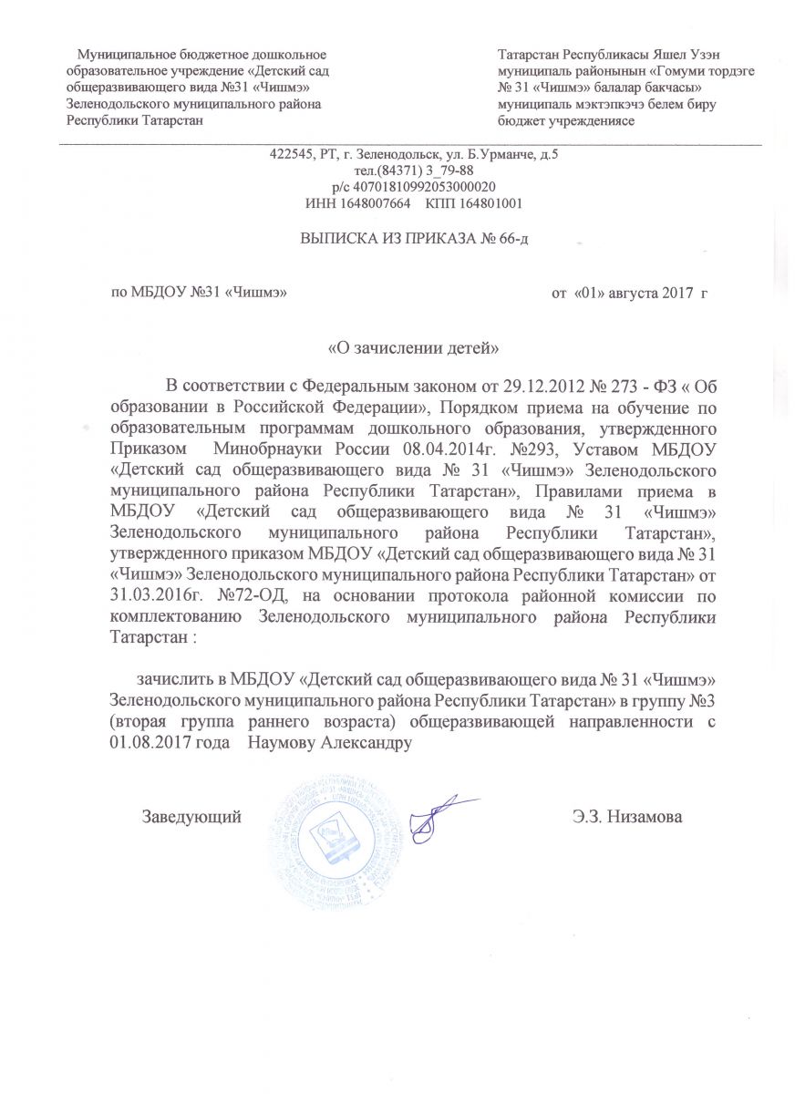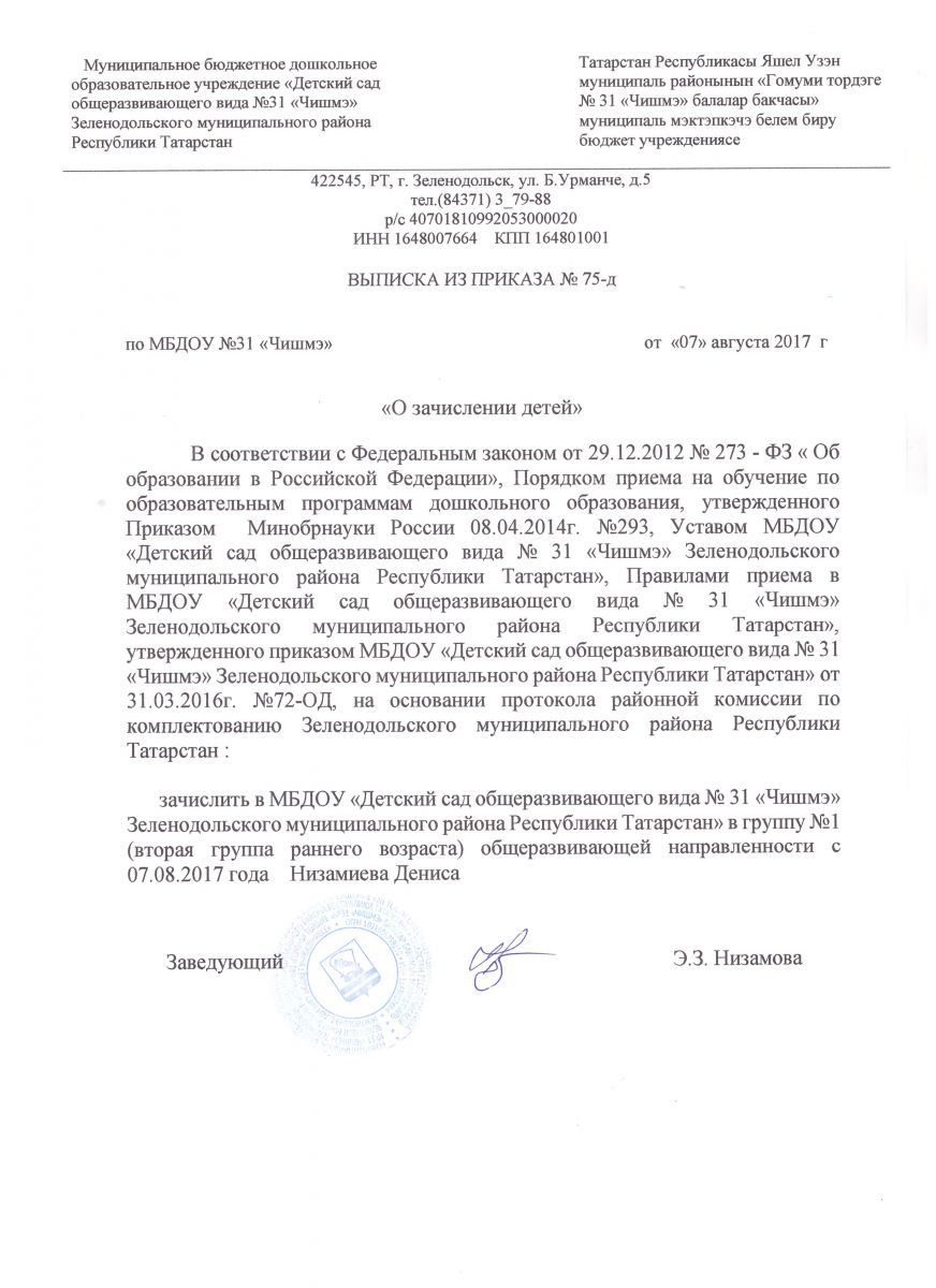 Выписка из приказа о зачислении Насыбуллина Гаделя
