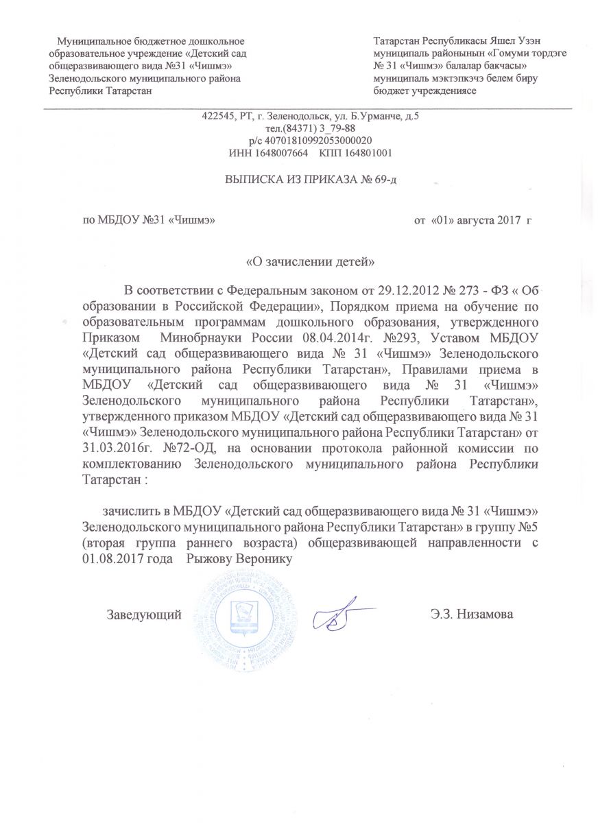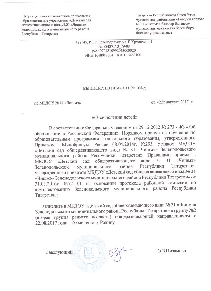 Выписка из приказа о зачислении Ахметзяновой Ралины