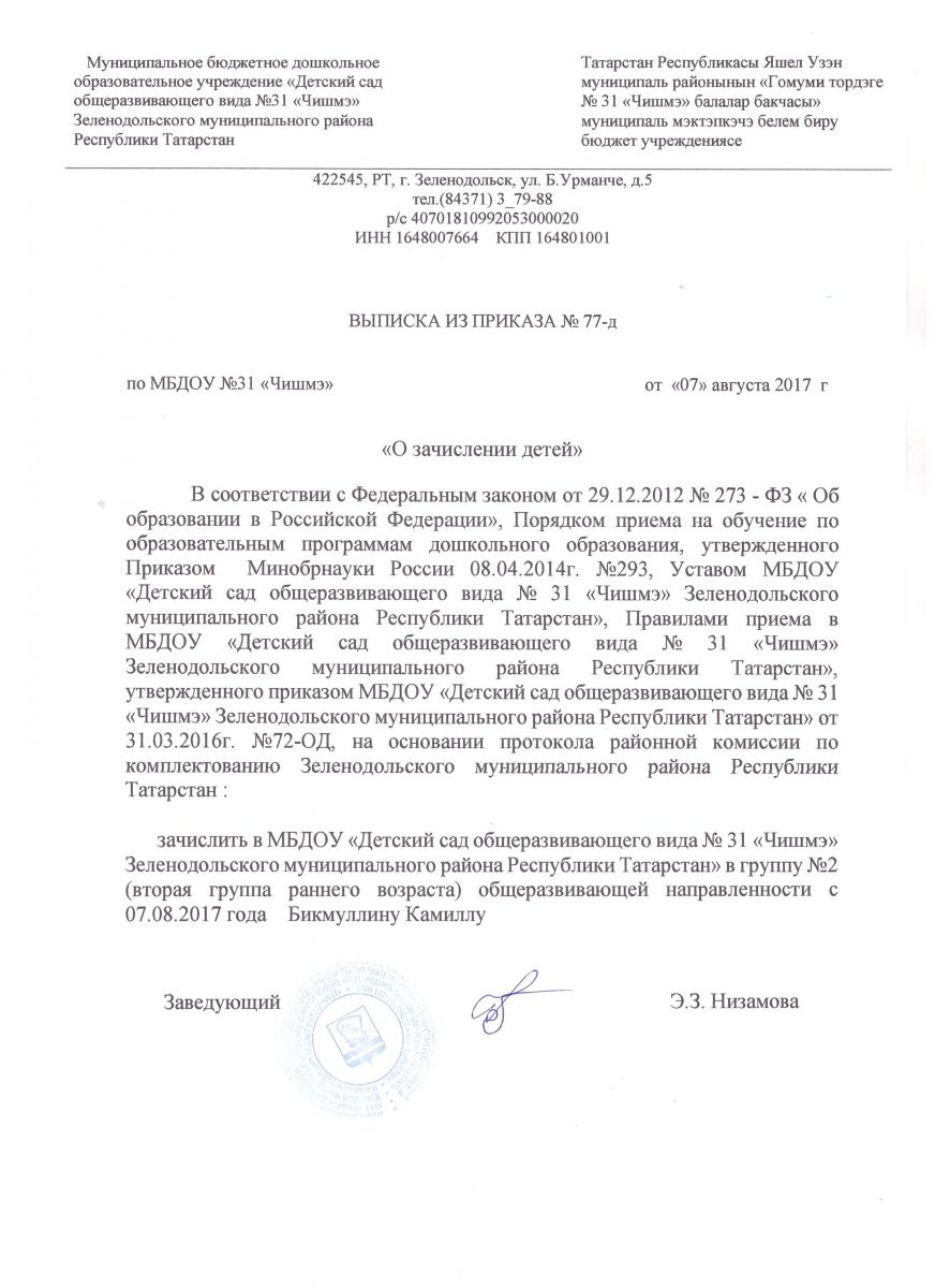 Выписка из приказа о зачислении Бикмуллиной Камиллы
