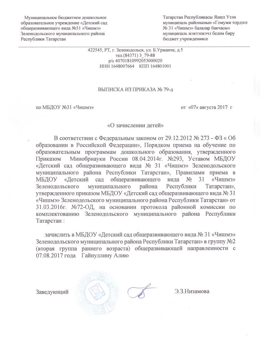 Выписка из приказа о зачислении Гайнуллиной Алии