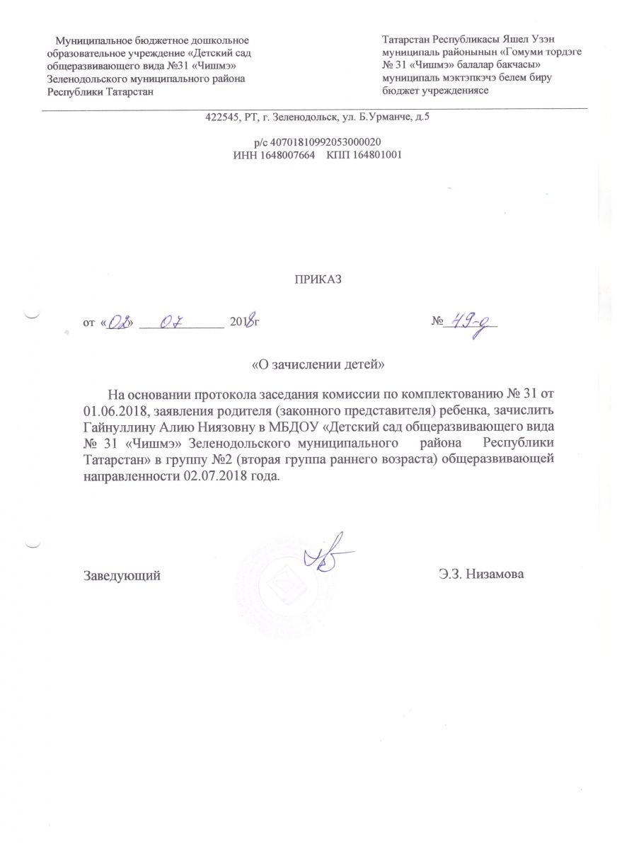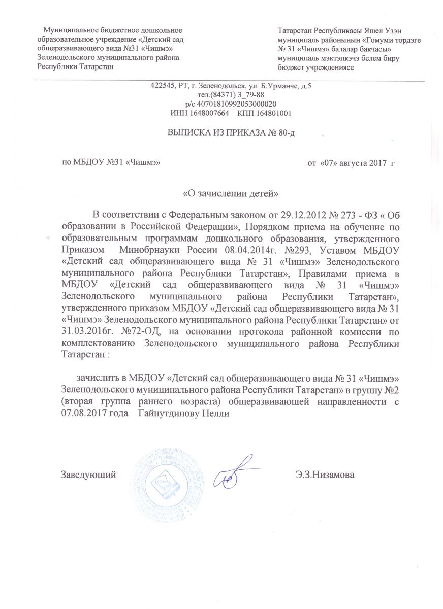 Выписка из приказа о зачислении Гайнутдиновой Нелли