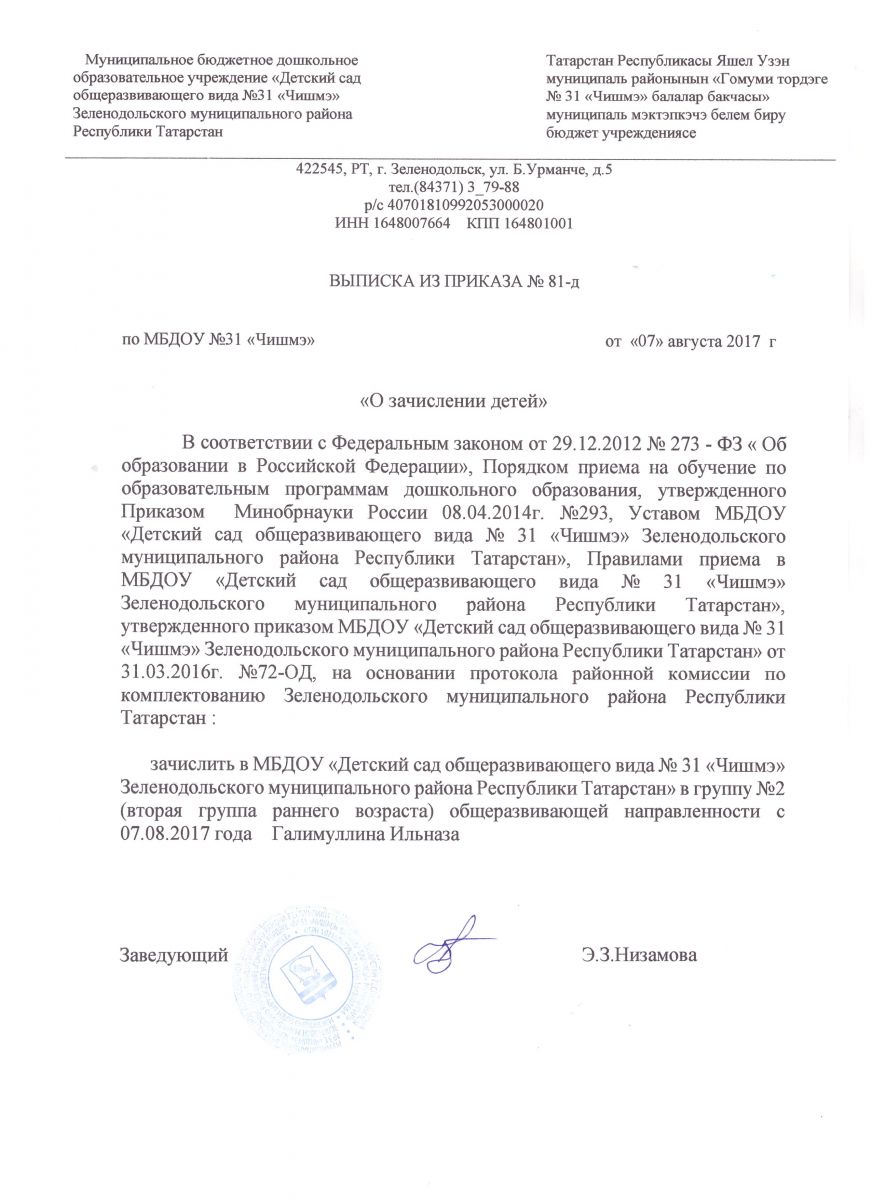 Выписка из приказа о зачислении Галимуллина Ильназа