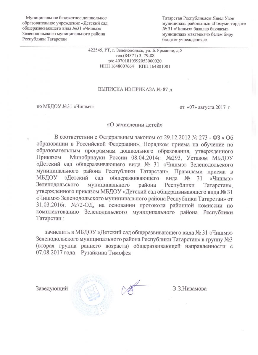 Выписка из приказа о зачислении Рузайкина Тимофея