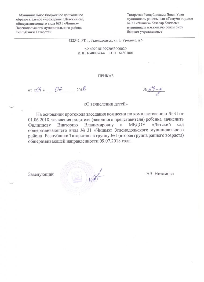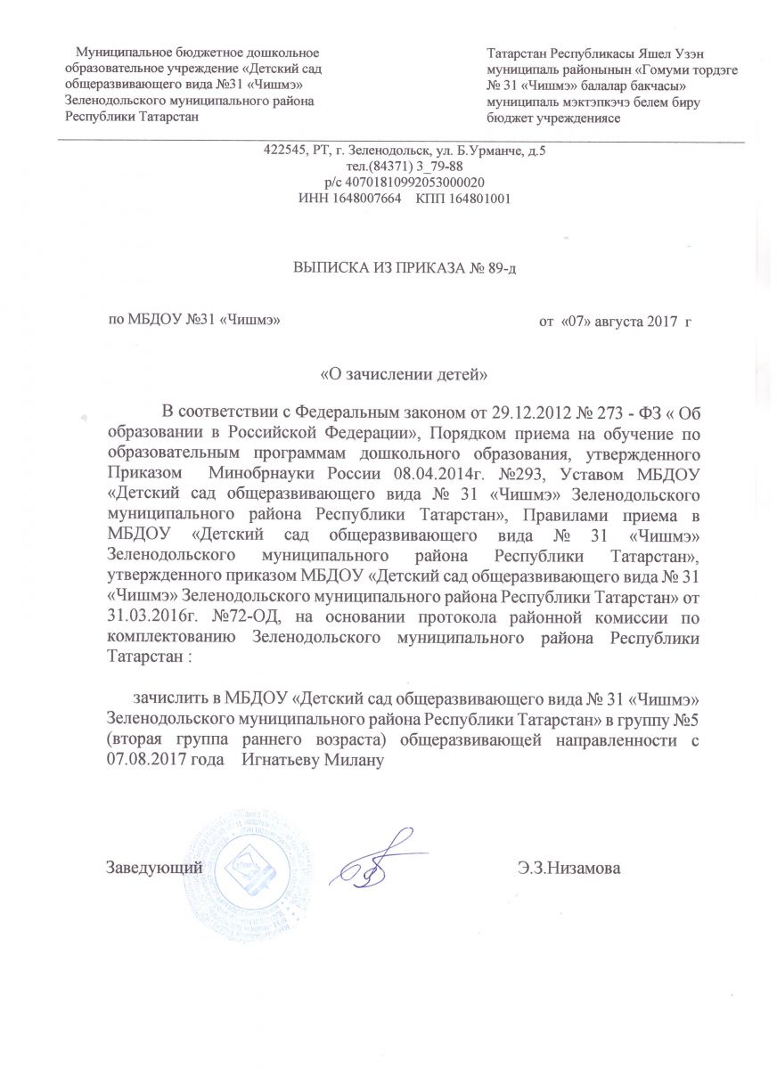 Выписка из приказа о зачислении Игнатьевой Миланы
