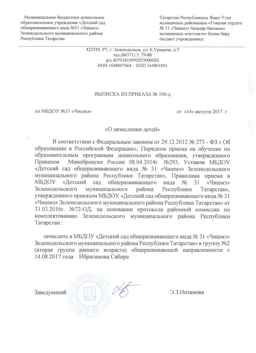 Выписка из приказа о зачислении Ибрагимовой Сабиры